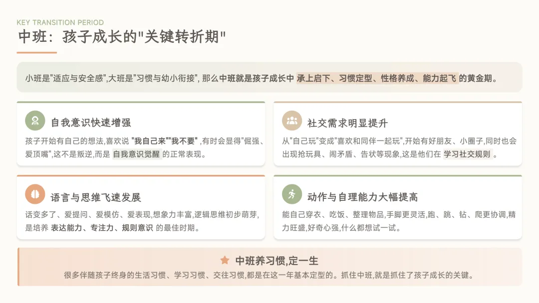 小班关注适应与生活习惯,中班开始能力发展与规则意识,大班逐渐进入学习准备阶段。