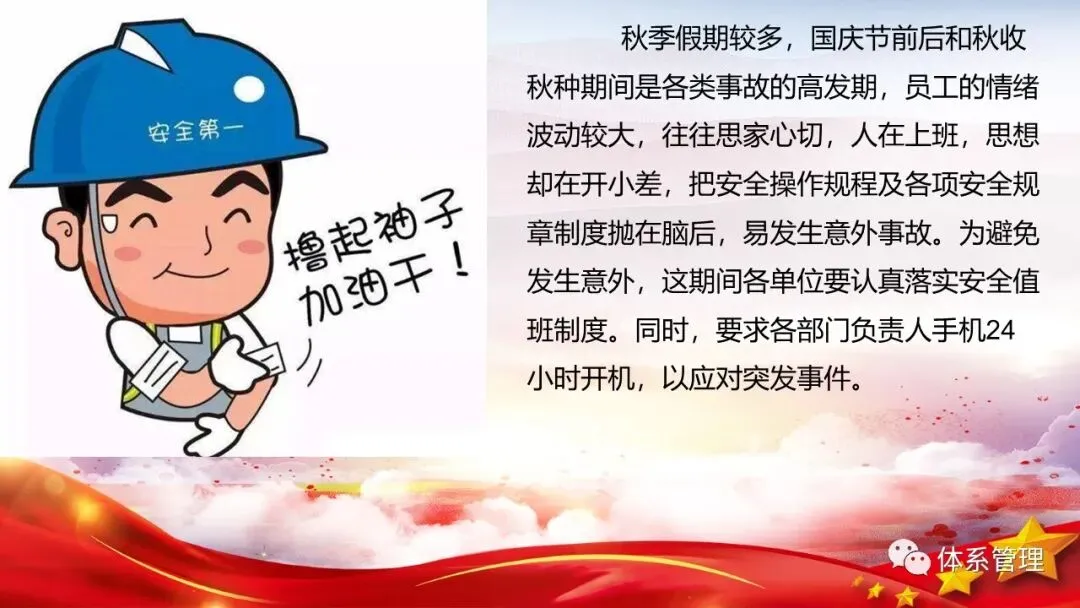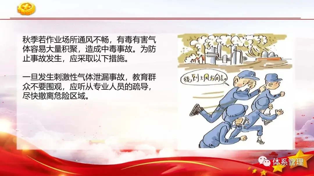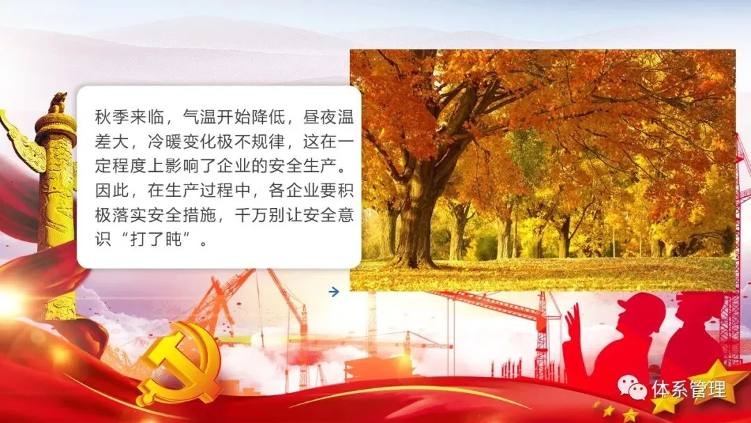 秋季来临,气温开始降低,昼夜温差大,冷暖变化极不规律,这在一定程度上影响了企业的安全生产。因此,在生产过程中,各企业要积极落实安全措施,千万别让安全意识“打了盹”。