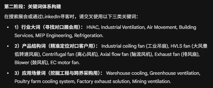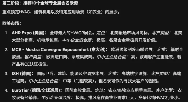 以前怎么开发客户?在 Google 上搜产品词,或者在领英上搜 Purchasing Manager(采购经理)。没有系统拆分市场和做过规划的搜索,结果搜出来的全是同行 。就如昨天晚上的(全球展会资源结合LinkedIn开发中我们讲到的:🎯 展会名录型客户开发战略引擎 · AI指令,仅需要提供一个产品词,就能出现如下图中的详细规划)