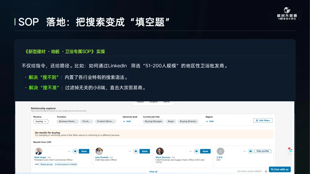 而在 PPT 里,我们拆解了《新型建材·卫浴》行业的搜索 SOP。你把公司的产品简介(比如主打无铅纯铜、极简设计)喂给 Gemini,它会直接告诉你:你要找的不是底层采购,而是欧美建材商超里的 Category Manager(品类经理) 或者 Project Sourcing(项目寻源)。
