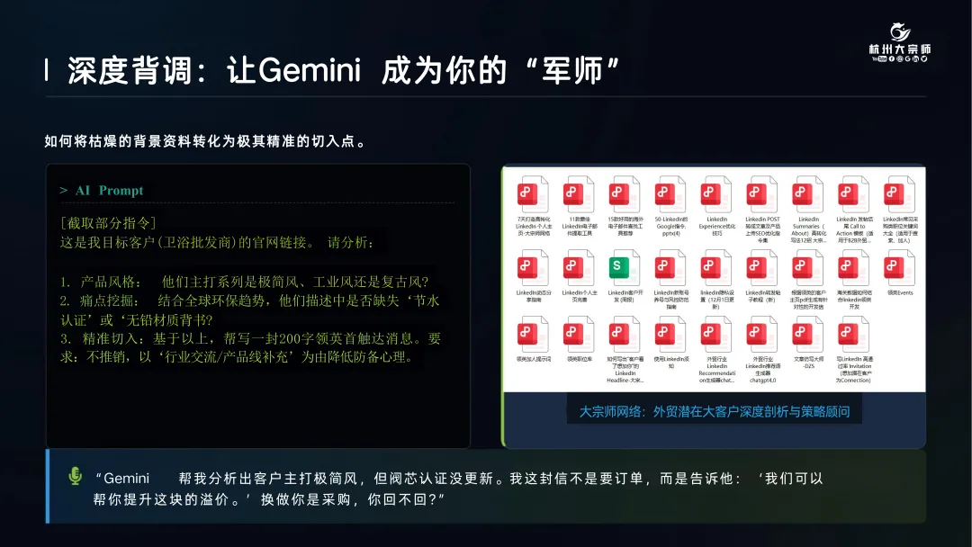 9号会用Gemini实 操如何用“利他性”逻辑激活 :让 Gemini 联网去搜过去一个月行业趋势、或者是近期海运费的异常波动 。把无聊的催单,变成一份极其专业的**“行业异动预警报告”**发过去。顺便专业地问问他的库存压力,最后给个“老客户/新询盘专属锁价期”的钩子 。