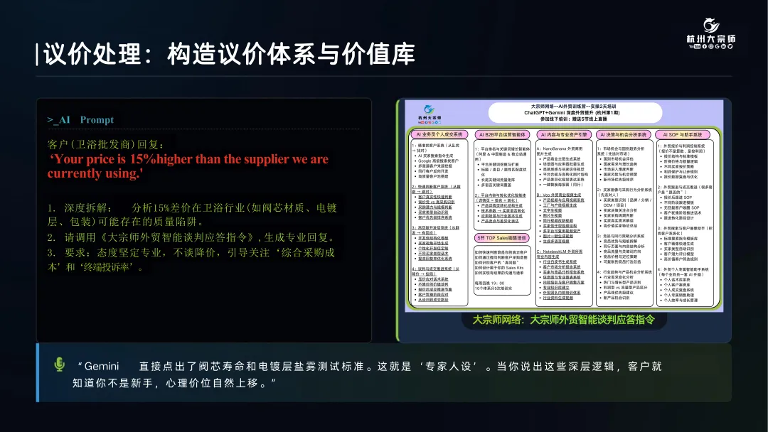 在AI外贸训练营的体系里,遇到这种情况,直接调用《智能谈判应答指令》 。让 Gemini 帮你深度拆解这 15% 差价在卫浴行业里隐藏的质量陷阱——比如低端阀芯寿命极短、电镀层根本过不了盐雾测试标准 。