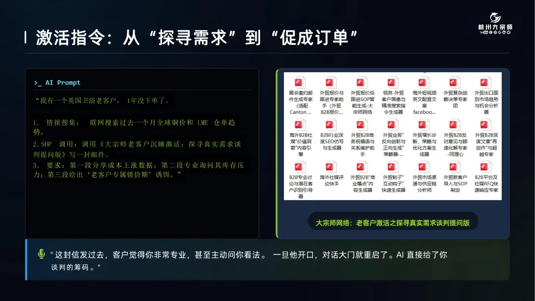 3月9号,大宗师网络有一场 90 分钟的线上实操公开课。今天,我把这份内部 PPT 的内容提前公开一部分。就拿课件里大宗师整理的【14大行业专属 SOP】 中的真实案例给大家看看,真正能拿谈订单 的 AI,到底是怎么用的。