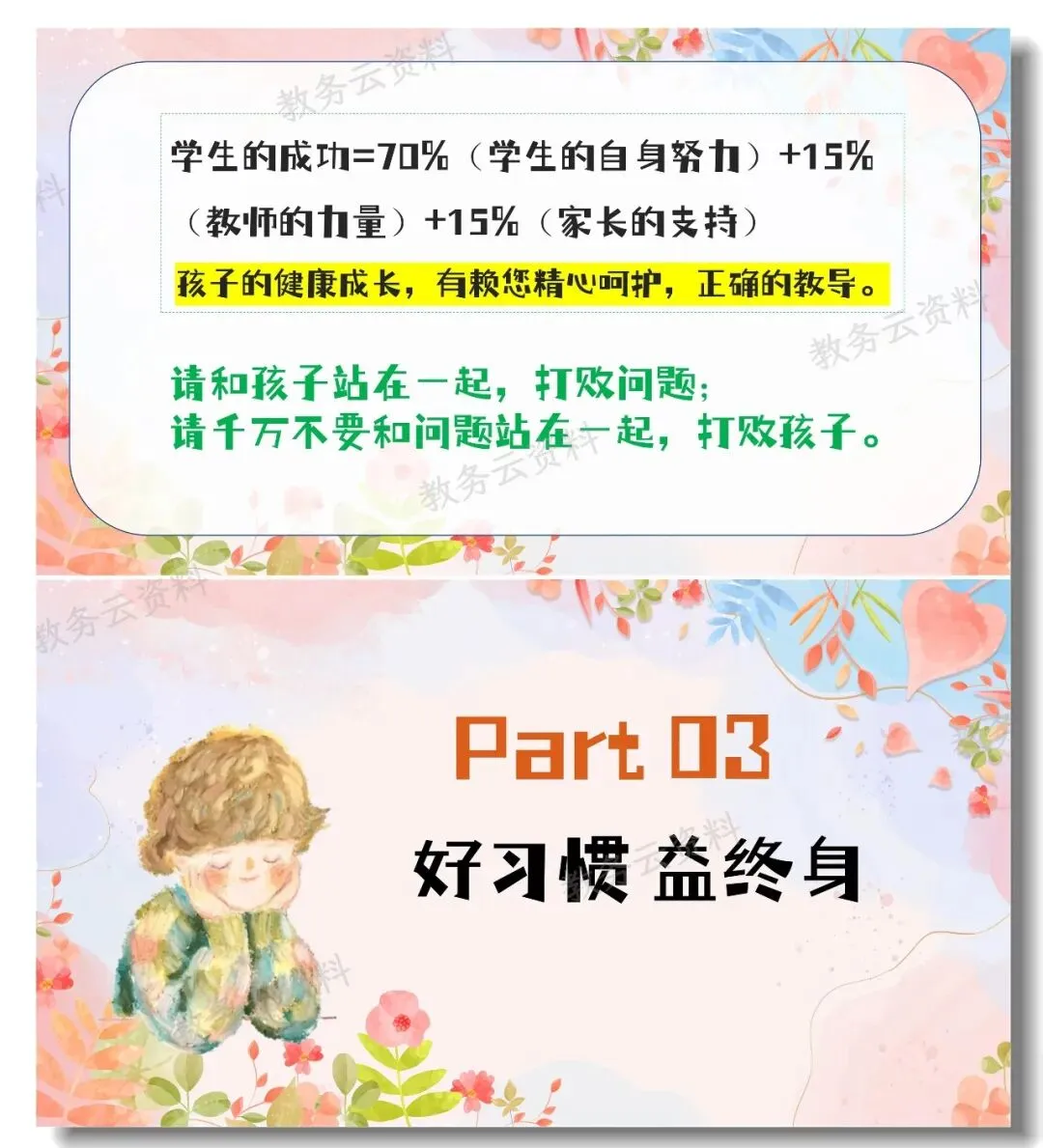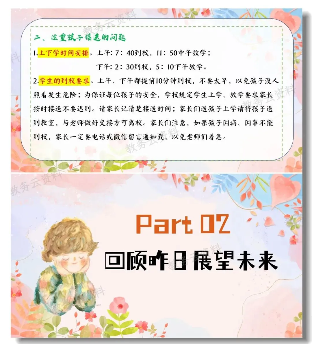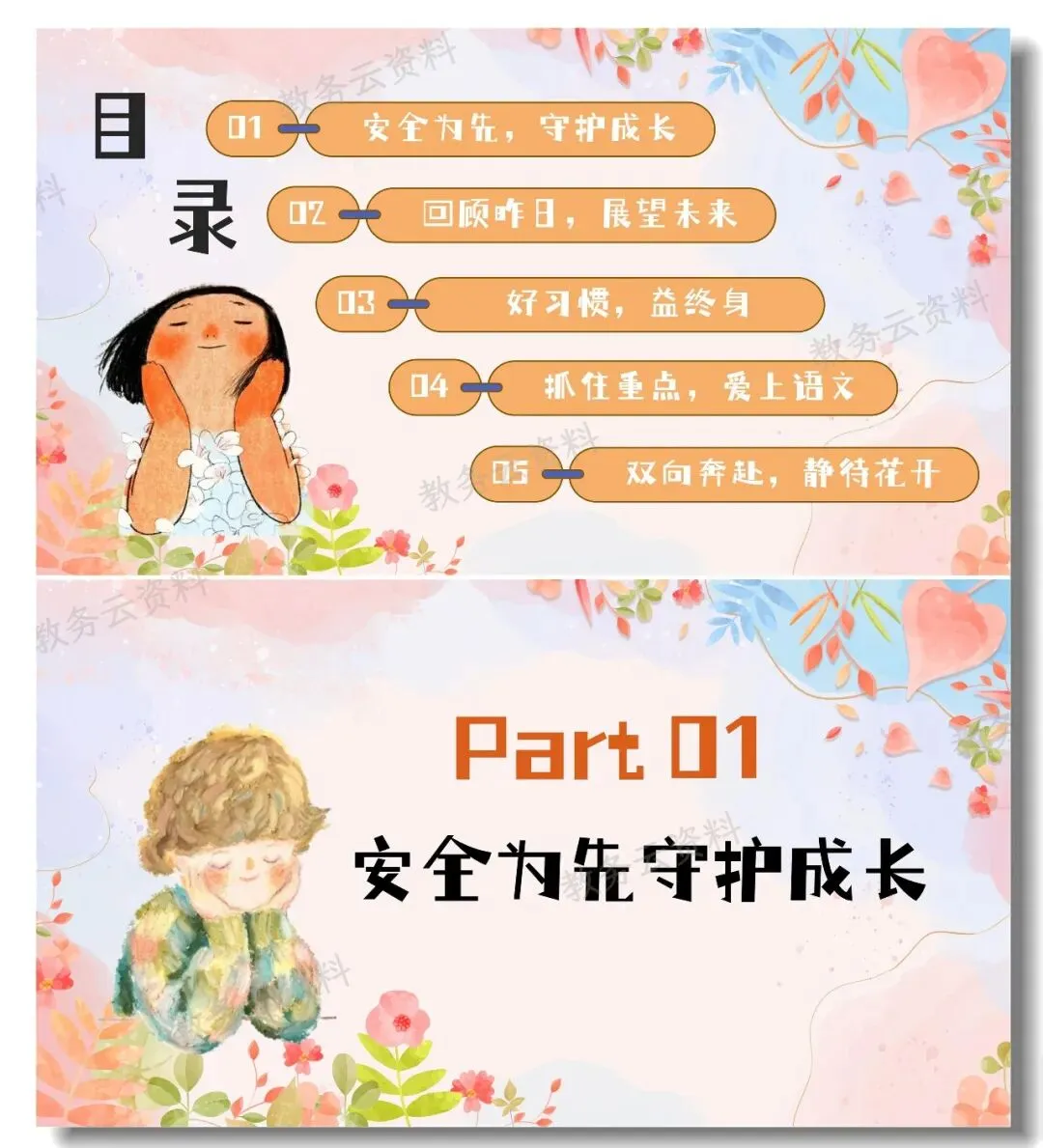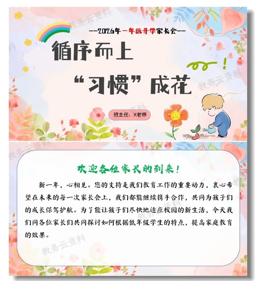 很高兴在这与您相遇,如果您是一位班主任老师,每天除了应对繁重的教学工作,还要加班整理班级、教务、教研、课件PPT资料,请关注下方的“教务云资料”,让我们风雨同路、一起成长!开学了,如何帮孩子快速适应?这场家长会给出了答案:安全是底线,习惯是核心,语文是重点,家校是合力!今天分享的是一年级春季下学期,开学家长会ppt课件,主题是《循序而上,“习惯”成花》,新学期,我们与孩子一起“循序而上”。课件PPT一共44页,配套班主任语文老师家长会发言稿。(文末有课件资料的获取方式)点击下方图片,打开小程序,付费查看,可自助下载资料,课件下载后无水印、可编辑、可修改!