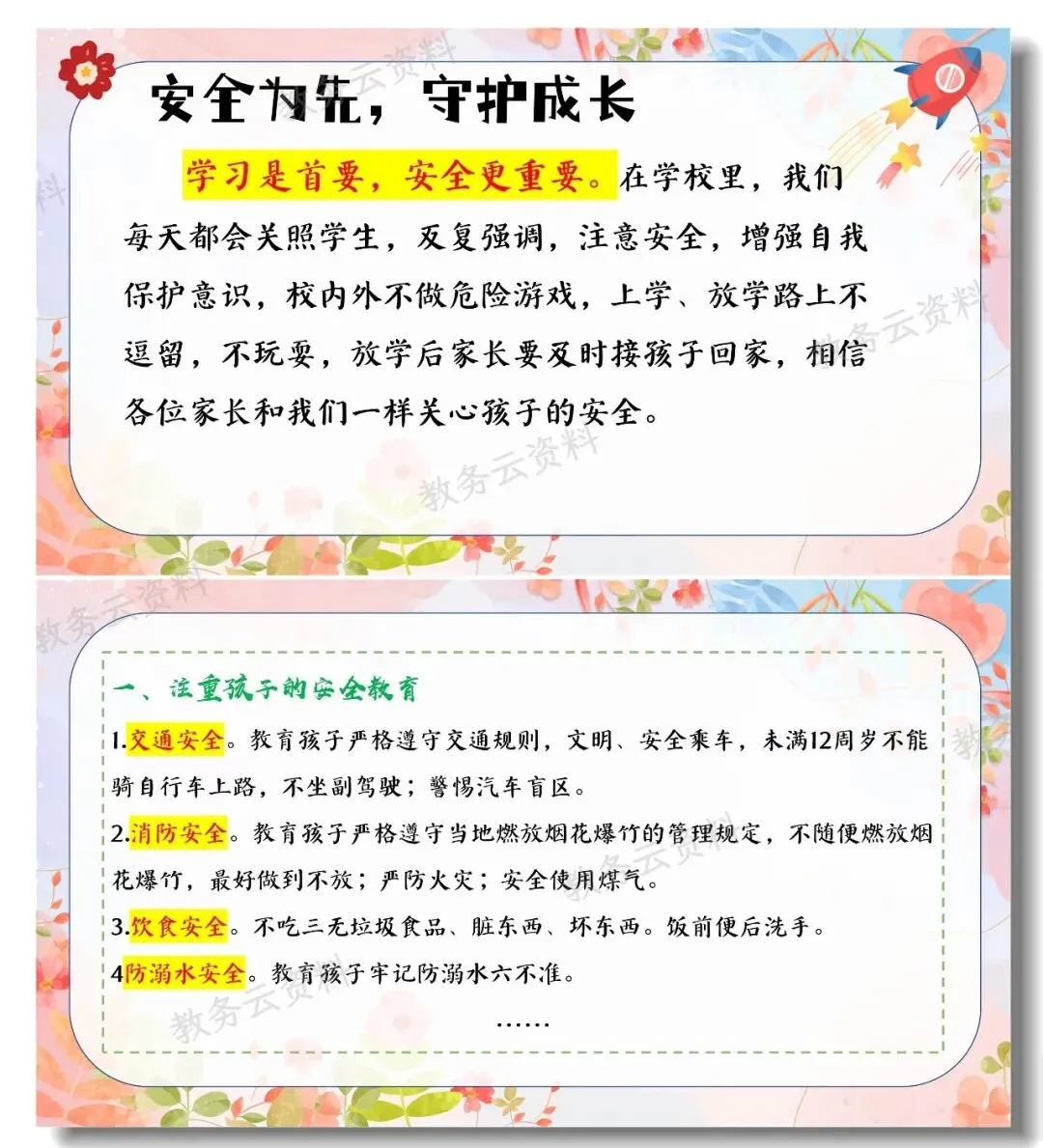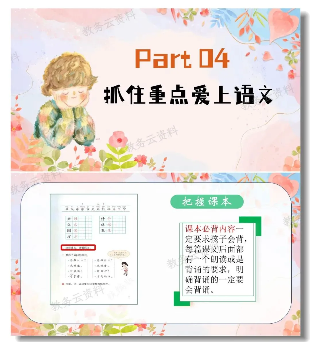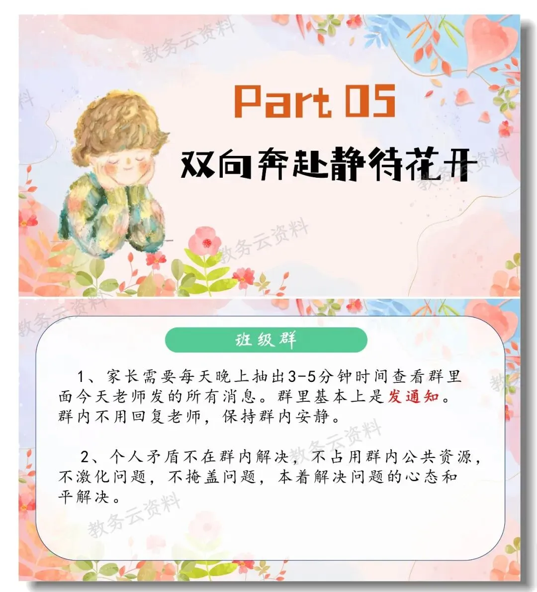 很高兴在这与您相遇,如果您是一位班主任老师,每天除了应对繁重的教学工作,还要加班整理班级、教务、教研、课件PPT资料,请关注下方的“教务云资料”,让我们风雨同路、一起成长!开学了,如何帮孩子快速适应?这场家长会给出了答案:安全是底线,习惯是核心,语文是重点,家校是合力!今天分享的是一年级春季下学期,开学家长会ppt课件,主题是《循序而上,“习惯”成花》,新学期,我们与孩子一起“循序而上”。课件PPT一共44页,配套班主任语文老师家长会发言稿。(文末有课件资料的获取方式)点击下方图片,打开小程序,付费查看,可自助下载资料,课件下载后无水印、可编辑、可修改!