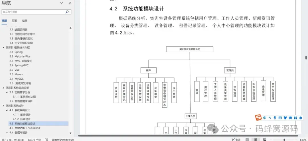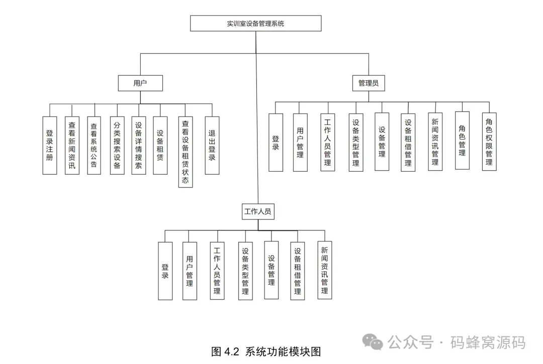 实训室设备管理系统包括用户管理、工作人员管理、新闻资讯管理、 设备分类管理、 设备管理、 租借记录管理、 个人中心管理的功能模块设计如图所示 :