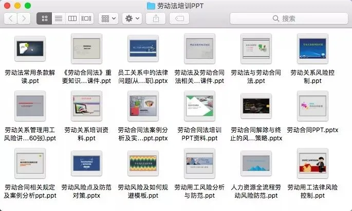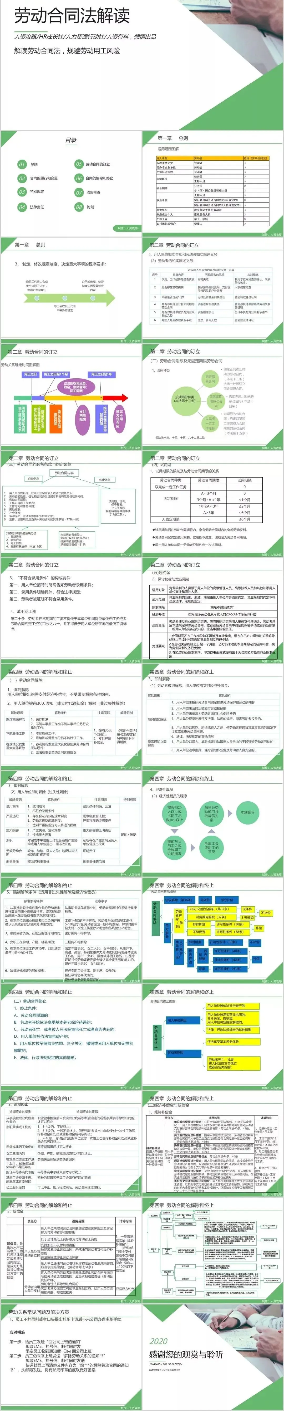 18套PPT,内容贯穿员工入职到离职全流程,覆盖劳动法、劳动合同法、劳动风险防范等内容。部分PPT多达100多页,适合自学提升,也适合内部培训使用。