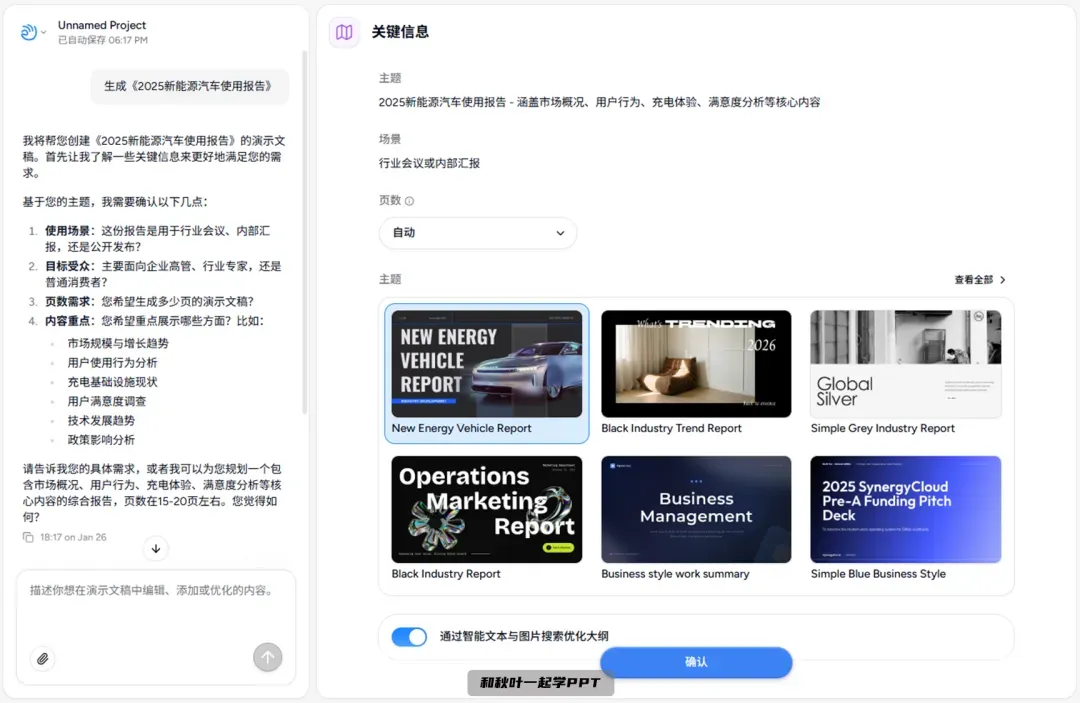 你可以选择喜欢的主题,也就是模板,并设置是否智能优化大纲。