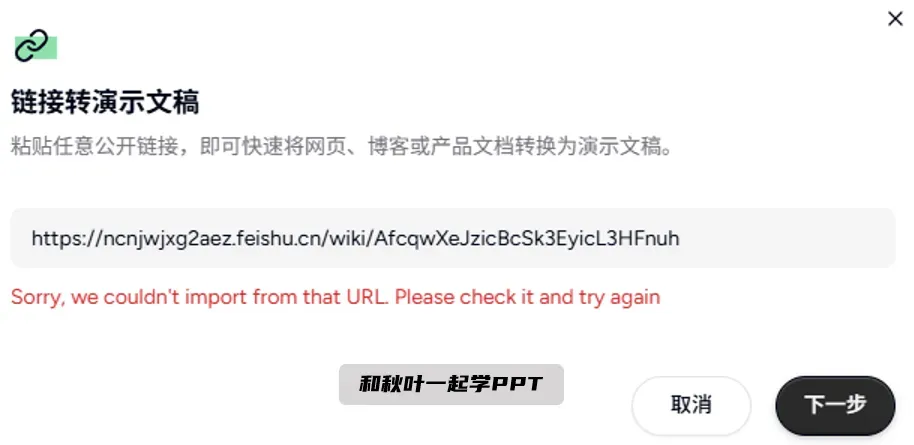 比如我们想把飞书的在线文档转成 PPT,粘贴链接之后,它根本识别不了,白忙活一场 ↓