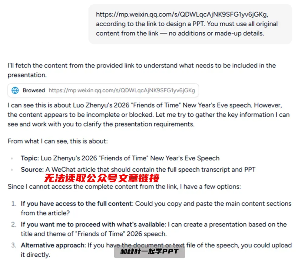 还有人可能看到一篇公众号好文,想整理成 PPT,我们也试了粘贴公众号文章链接,结果还是不行,读不出来内容 ↓