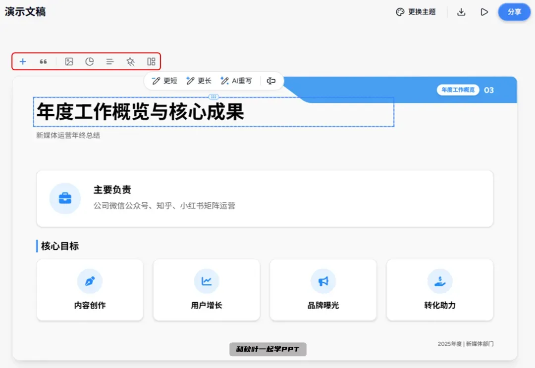 另外,你也可以直接在右边的页面上,手动编辑修改,比很多 AI PPT 工具都要方便。