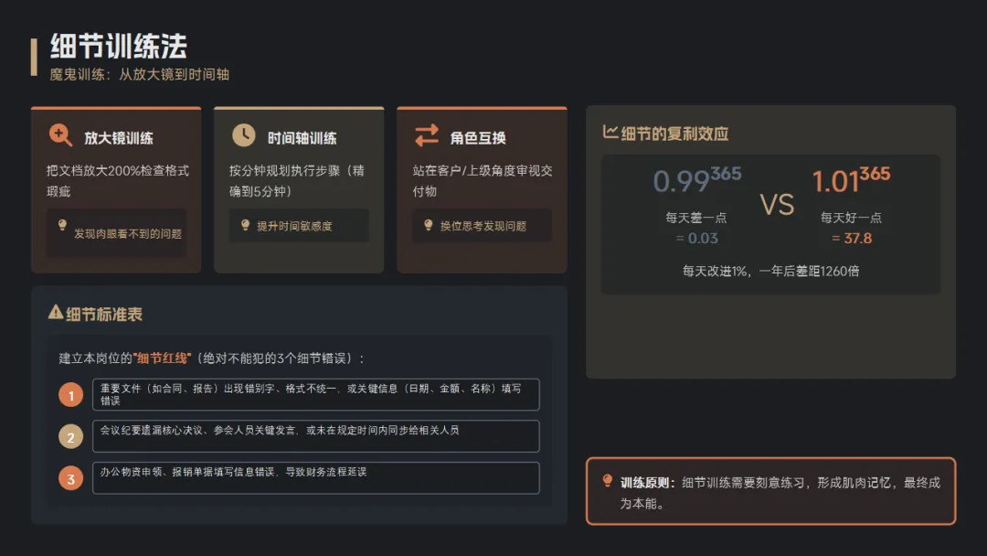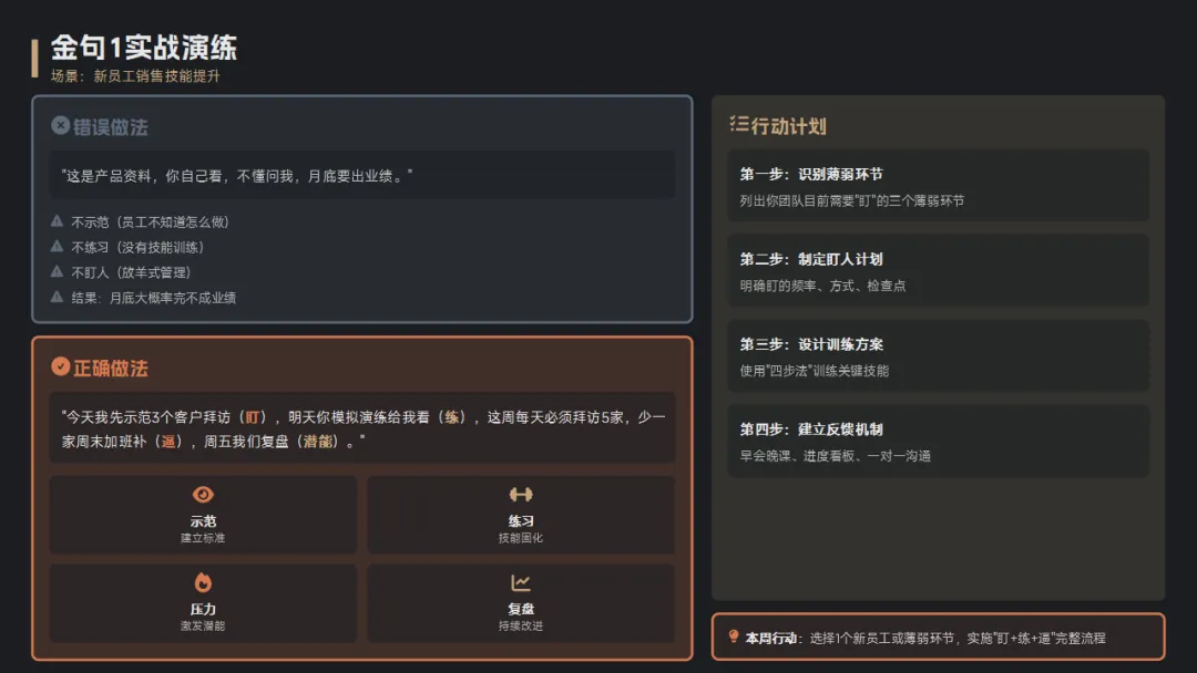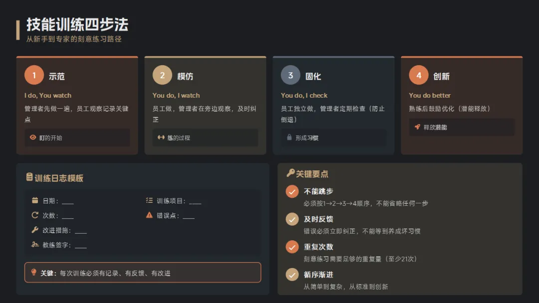 管理者先做一遍,员工观察记录关键点。这是"盯"的开始。很多人跳过这一步,直接让员工去做,结果错误百出。