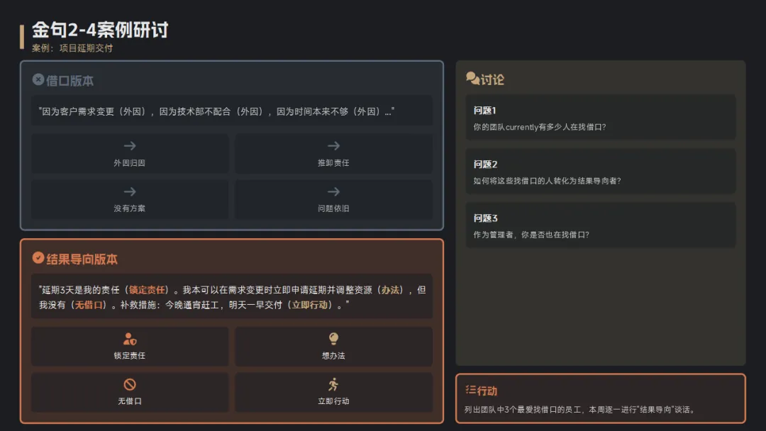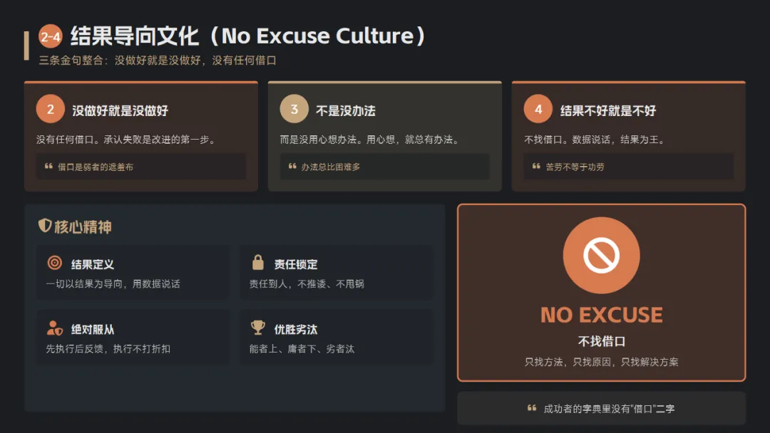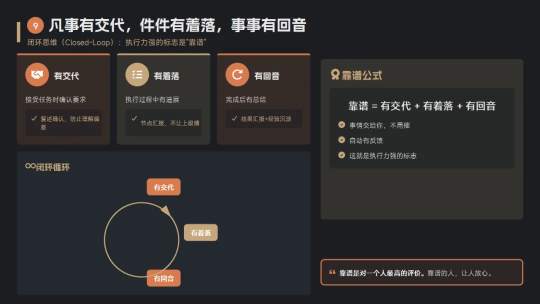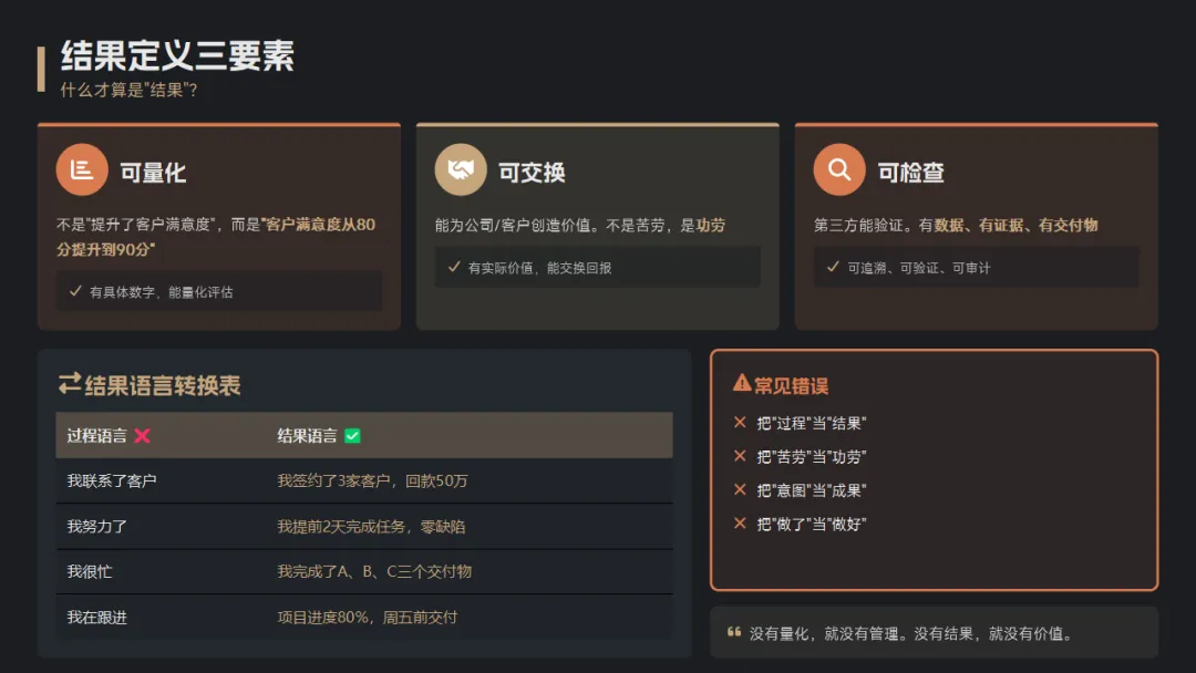 ——以终为始,不留死角。凡事有交代,件件有着落。结果度解决的是"做到什么结果"的问题。