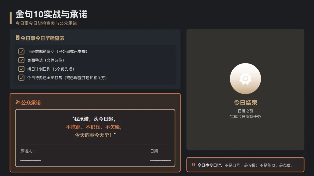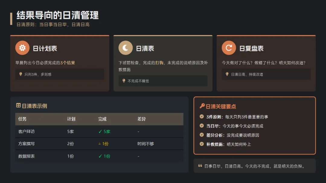:盯今日结果。复盘今天完成了什么,没完成什么,为什么。
