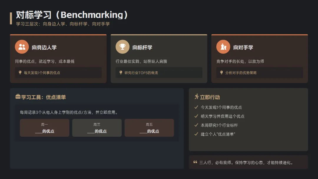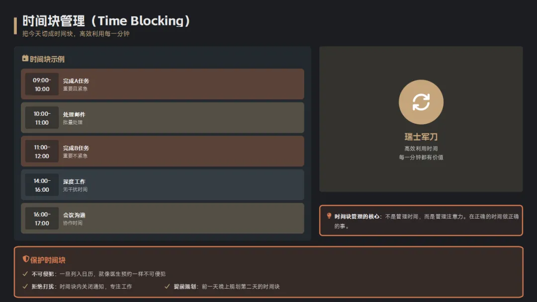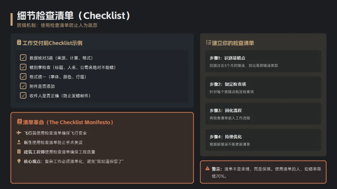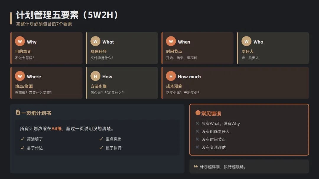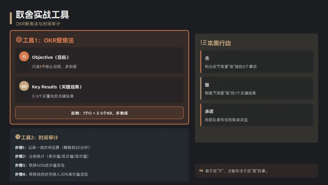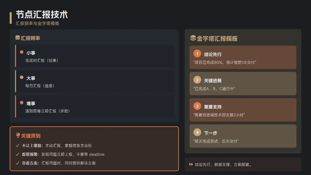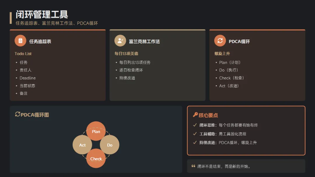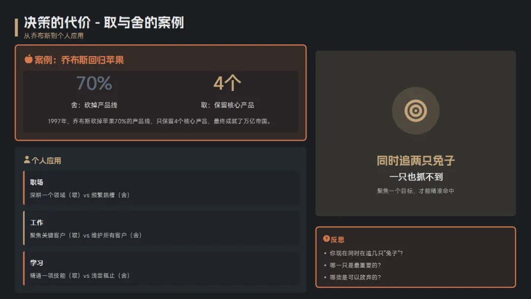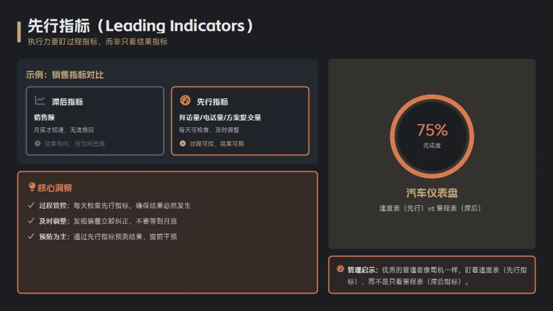 :关注关键节点,而非每个细节。就像开车,你不需要盯着发动机的每一个齿轮,但你要盯着仪表盘的速度表和油量表。