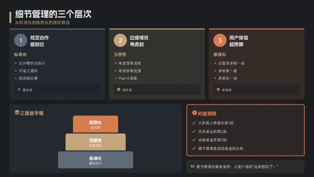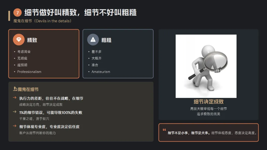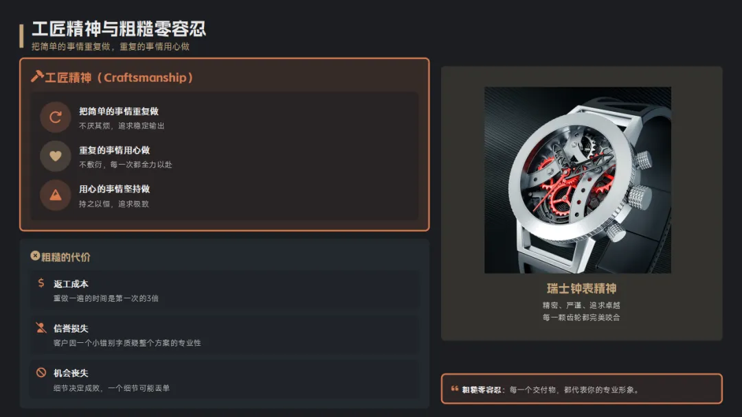 ——细节到位,不粗糙。精致 versus 粗糙。精度解决的是"做到什么程度"的问题。