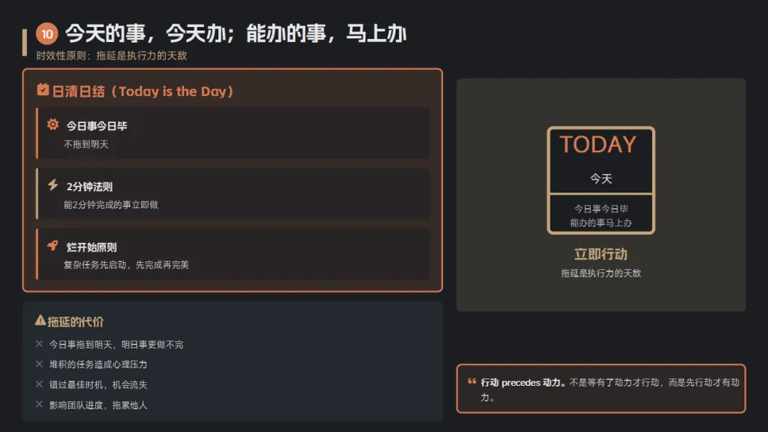 ——立即行动,不拖延。今天的事今天办。速度解决的是"什么时候做"的问题。