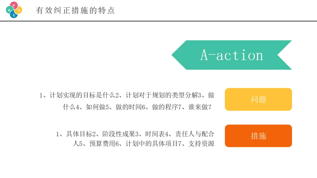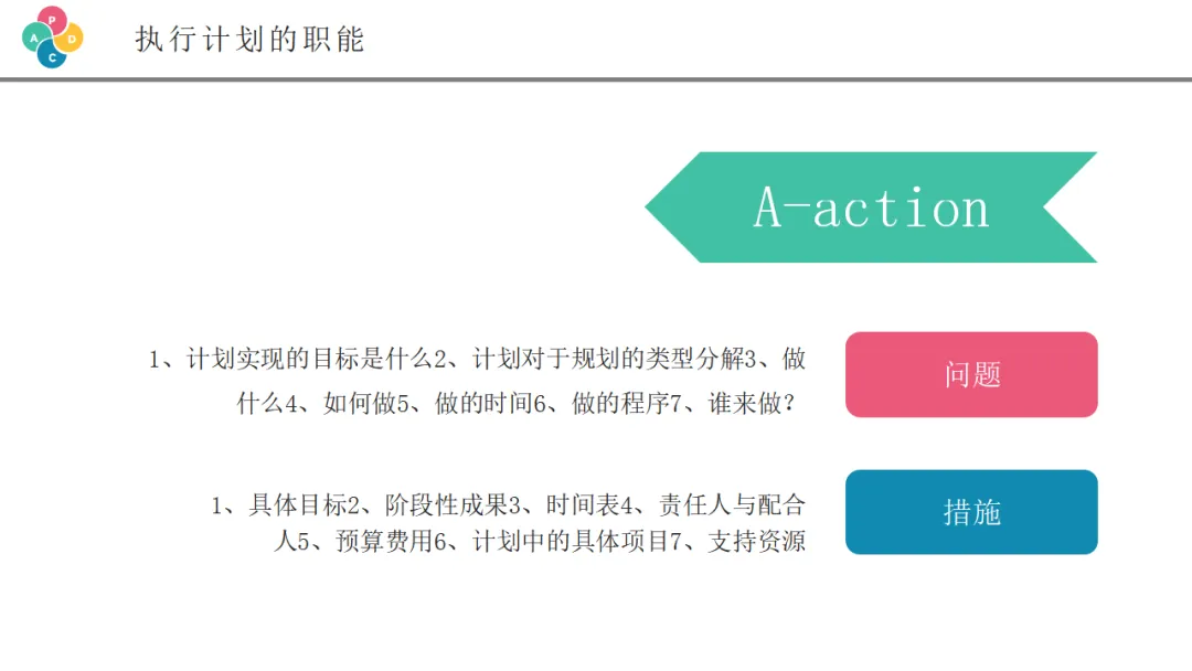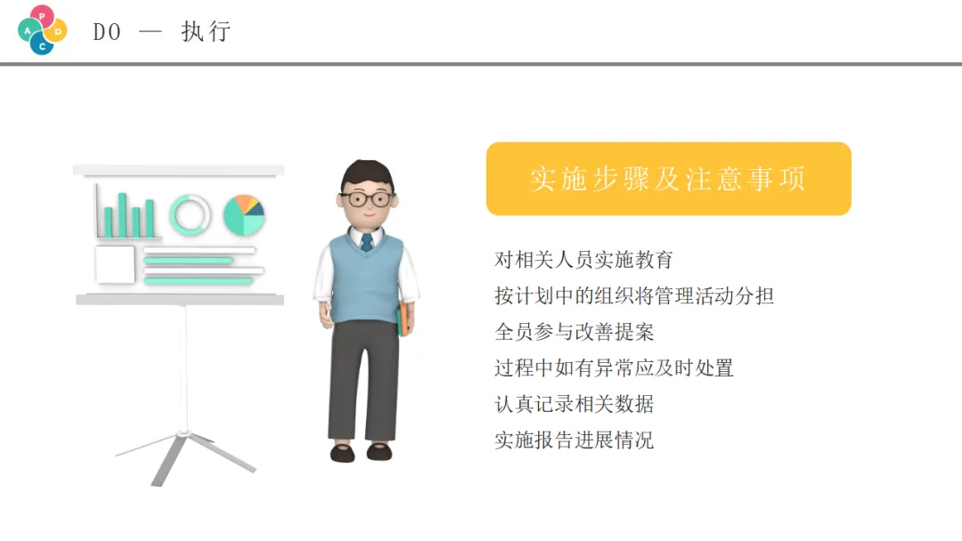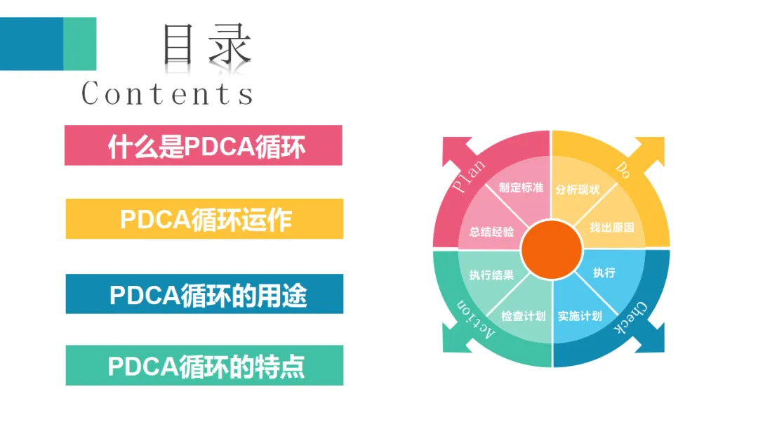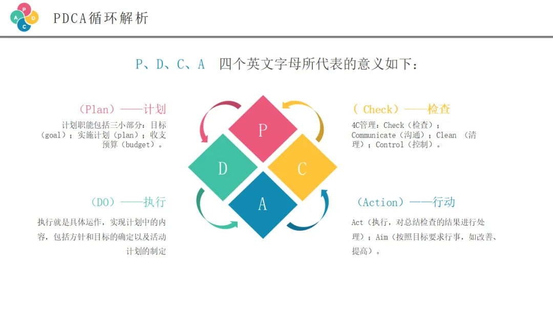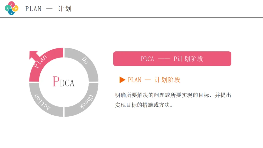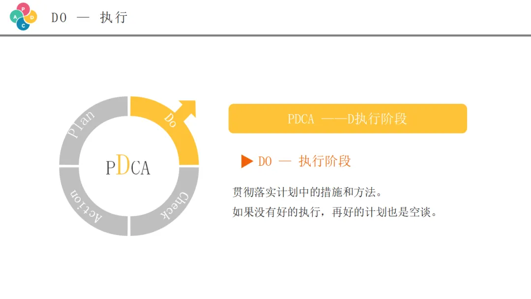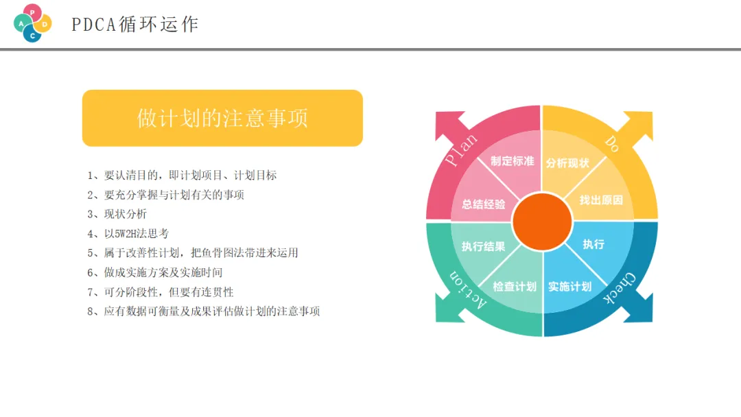 检查阶段是将执行结果与计划目标进行对比,评估效果的关键环节。虽然PPT中没有详细展开这一页,但这是PDCA循环中承上启下的重要一环。