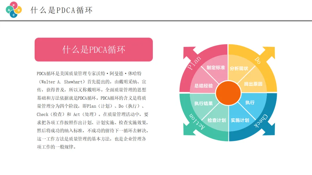 PDCA循环,又称"戴明环",是由美国质量管理专家沃特·阿曼德·休哈特首先提出,后经爱德华兹·戴明博士广泛推广的一种科学程序。它是全面质量管理的思想基础和方法依据,也是所有持续改进活动的基本逻辑框架。
