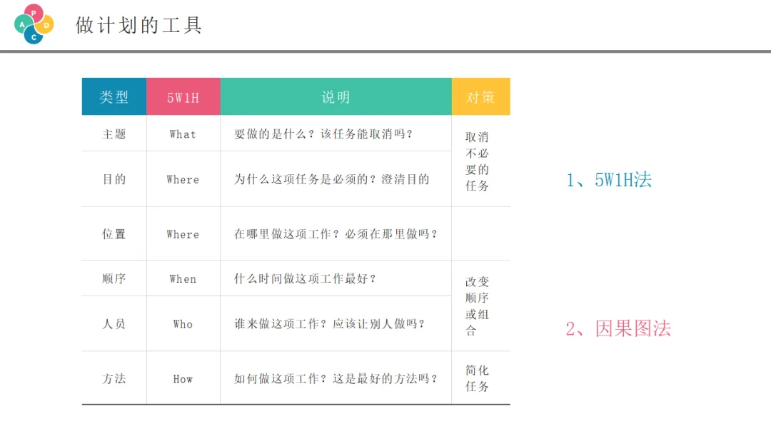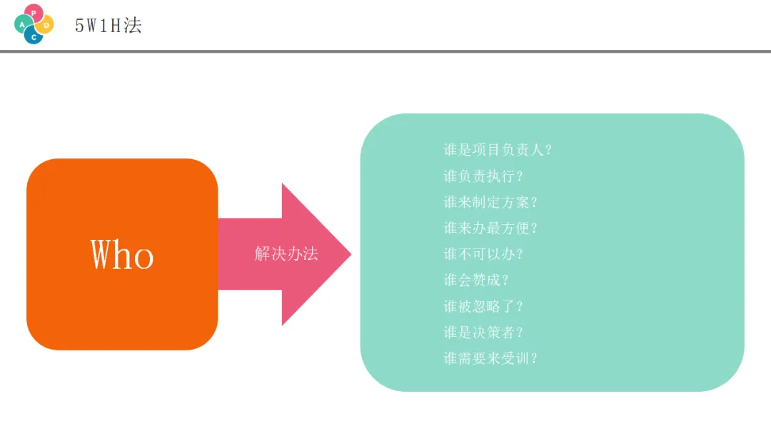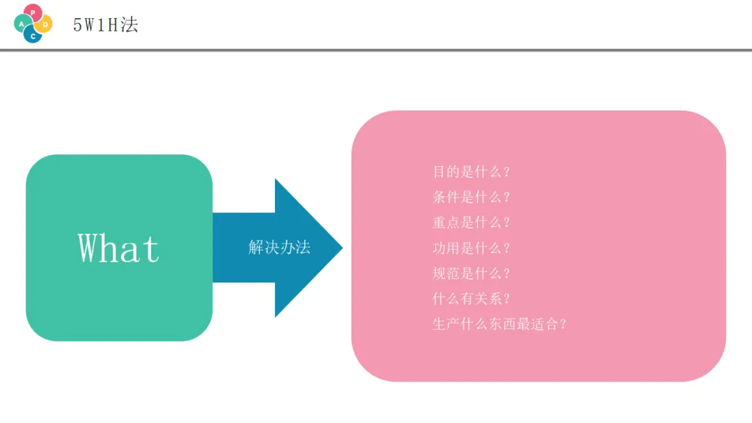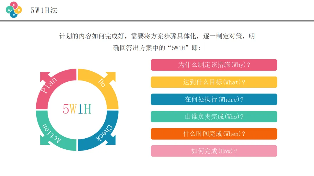 5W1H分析法,也叫六何分析法,是一种思考问题、制定计划的系统性工具。它要求我们在制定方案时,回答清楚六个方面的问题: