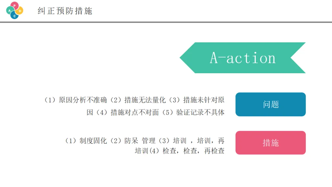 对于没有解决的问题,或者新发现的问题,要转入下一个PDCA循环。我们要分析为什么这些措施无效?是计划的问题还是执行的问题?需要采取什么新的对策?