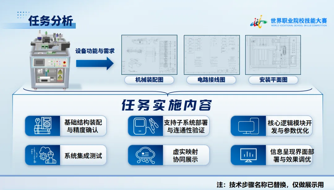 ①所需核心技能:用精炼的关键词点明这个步骤考验选手什么能力?如:“精密机械装配”、“复杂电路排故”、“PLC模块化编程”、“工业软件平台操作”、“安全规范应用”。