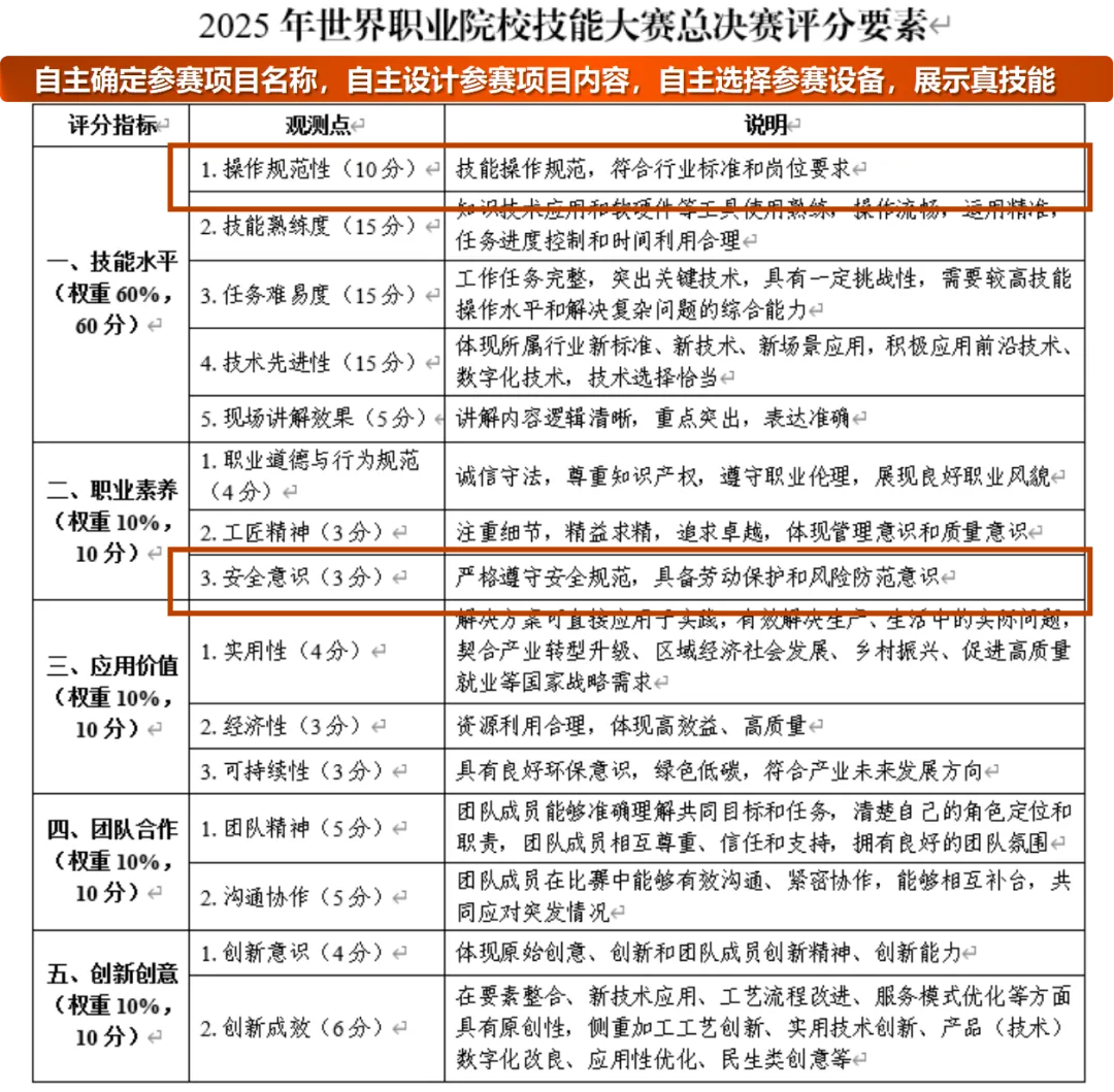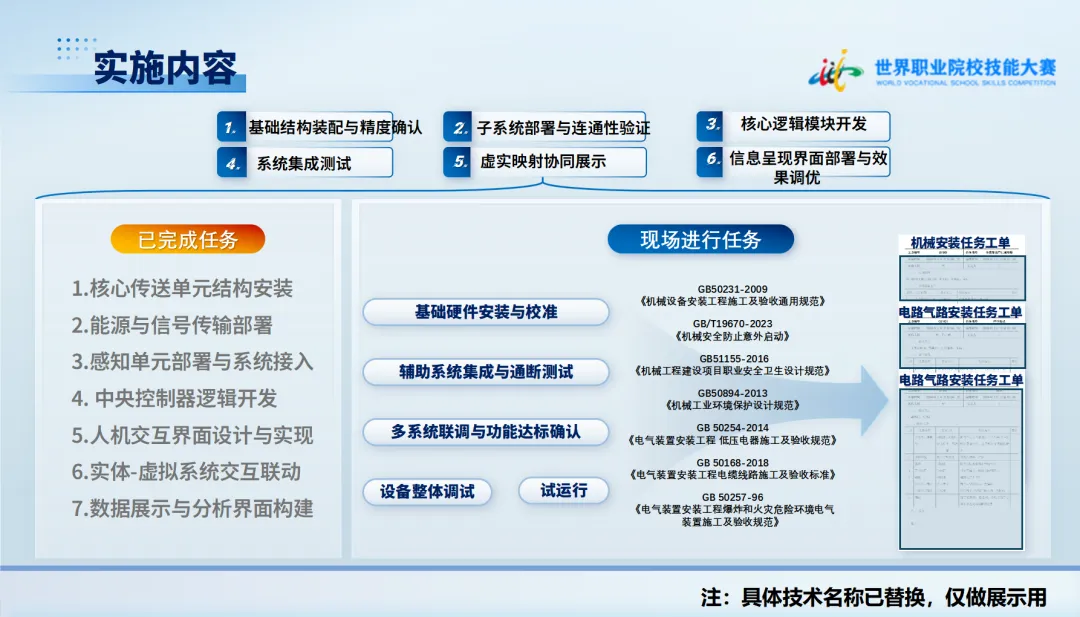 ③行业规范/标准背书:这是最具说服力、最容易被忽视的得分点!醒目地列出该步骤所遵循的关键国家标准(GB)、行业规范或安全操作规程的编号和名称。例如:“执行依据:GB50231-2009《机械设备安装工程施工及验收通用规范》,GB/T 19670-2003《机械安全 防止意外启动》…”。这直接证明了选手操作的规范性和职业素养(安全意识),是评分标准“操作规范性”和“职业素养”的重要证据!