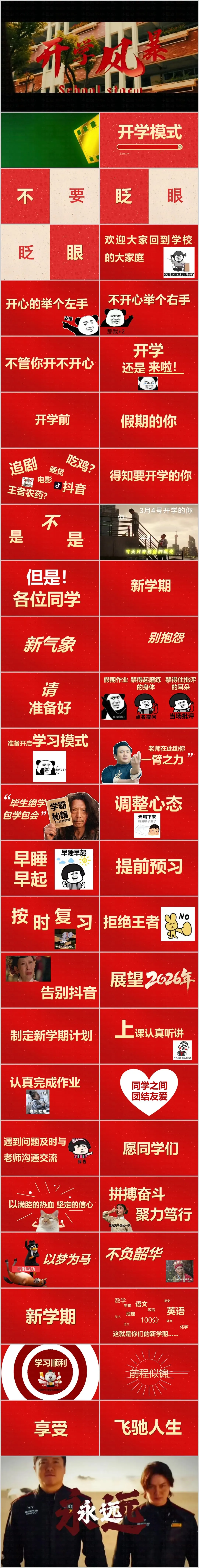 这份开学快闪PPT设计极具网感,节奏超快,完美适配Z世代学生的沟通方式。