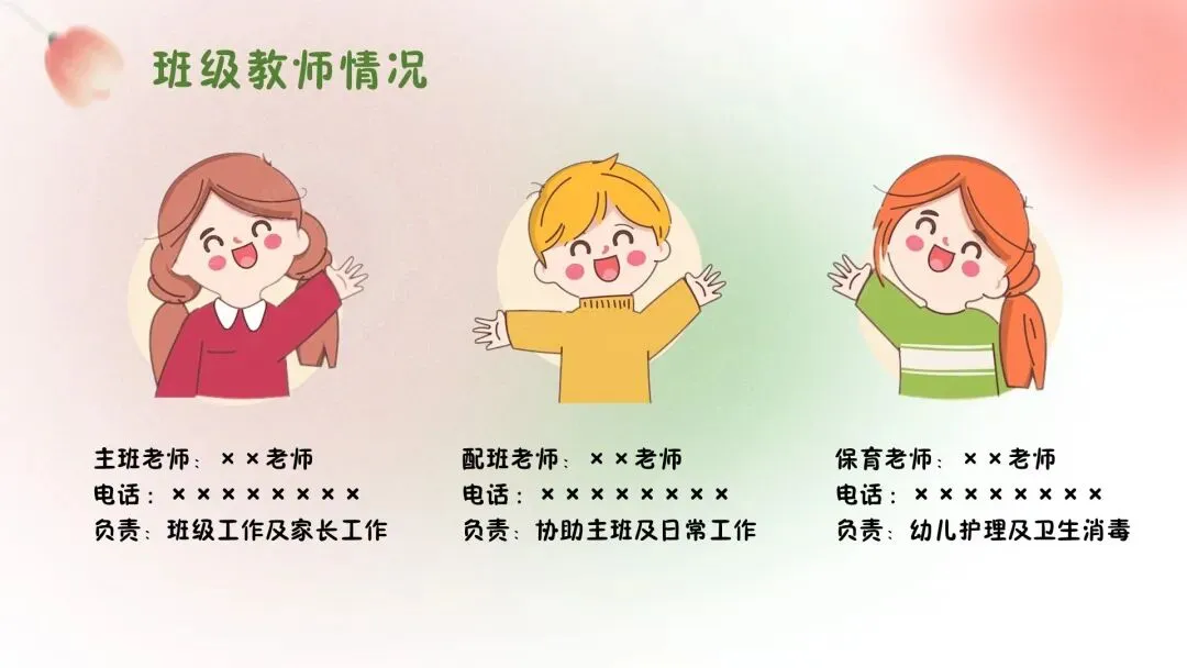 生活老师:×老师:负责班上的幼儿护理及卫生消毒工作