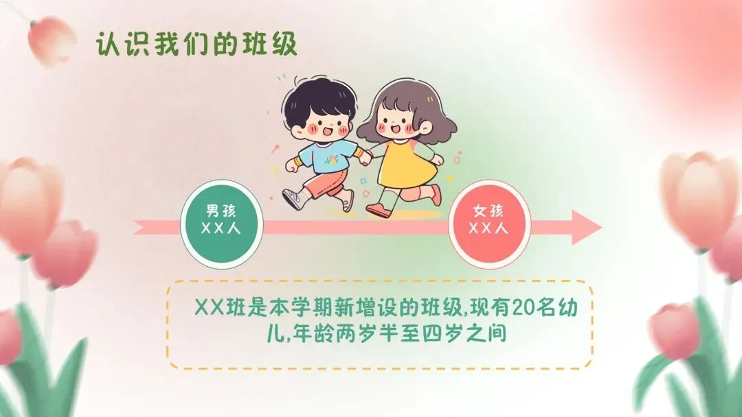 我们班共有幼儿xx名,其中男孩x名,女孩x名。X班是本学期新增设的班级,现有20名幼儿,年龄两岁半至四岁之间,刚入园幼儿的情绪较不稳定,家长也不放心。本学期我们班把重点放在幼儿的护理方面及安抚幼儿情绪等方面,本学期的主要任务是培养幼儿的生活自理能力,引导幼儿对幼儿