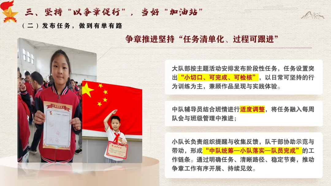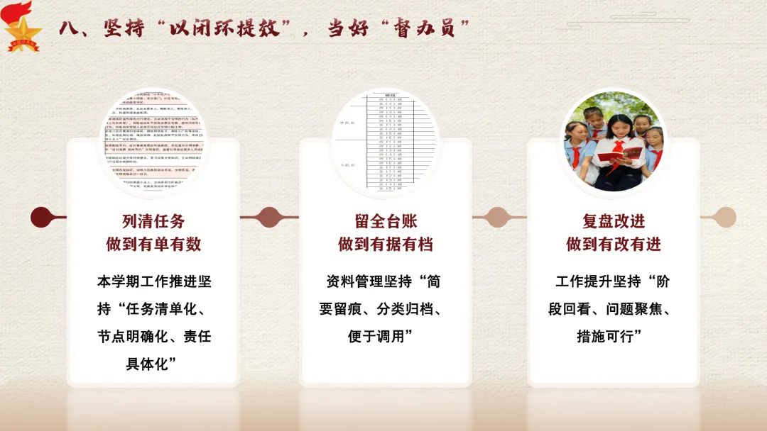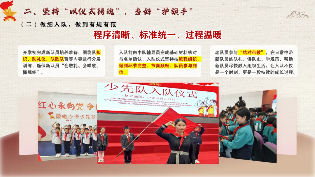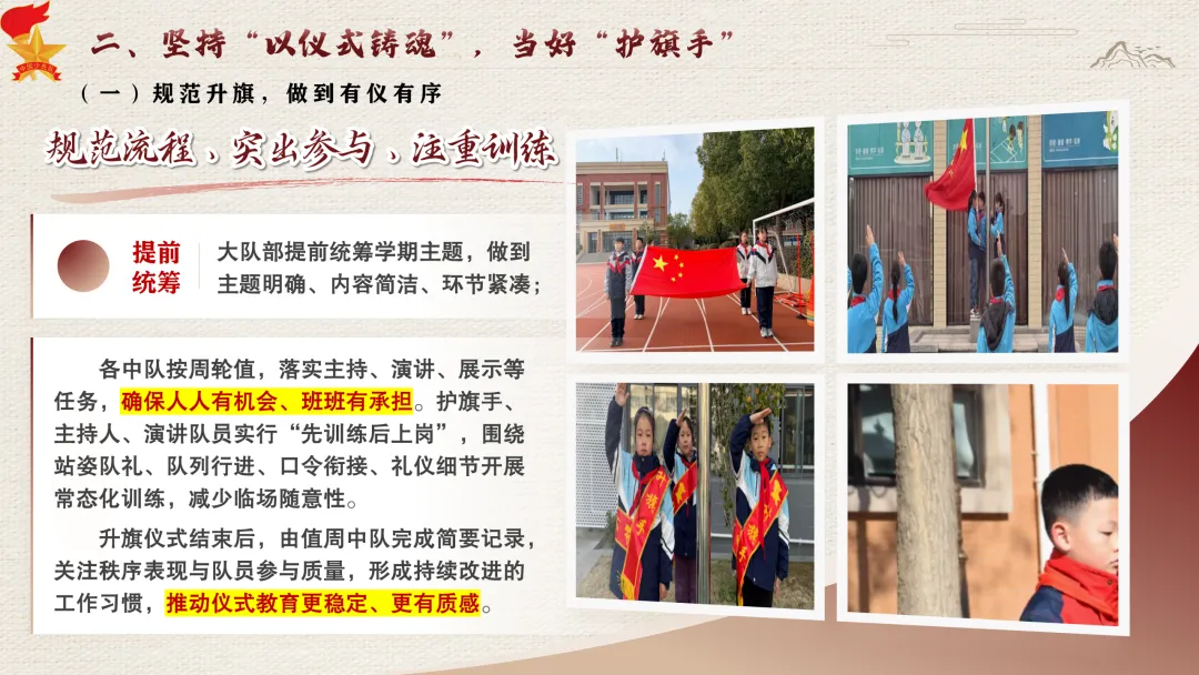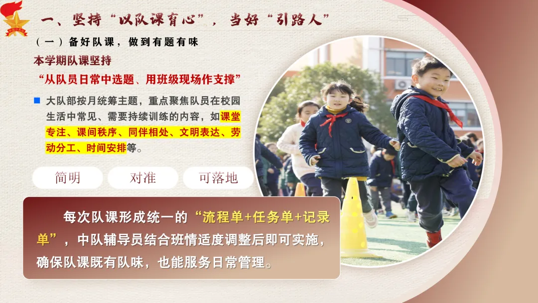 把少先队工作拆解为八大重点:以队课育心备好、用好、评好队课,以仪式铸魂规范升旗、做细入队、训练队礼,以争章促行细化章规、发布任务、记录过程,还有常规塑形、实践强能、阵地聚声、队伍提质、闭环提效五大板块,每个板块都有明确的工作要求、落地步骤和执行方法,拒绝空泛,全是可操作的干货。