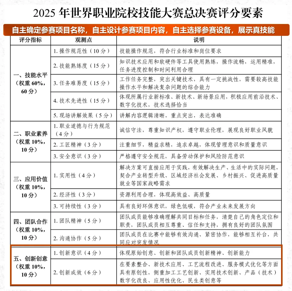 根据2025年世界职业院校技能大赛评分标准,创新创意的核心观测点集中在两大维度:“创新意识”(是否有原始创意)和“创新成效”(能否解决实际问题)。结合获奖项目,我们总结出4个高价值创新方向: