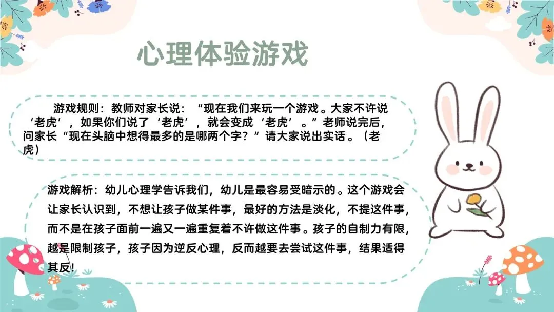光阴似箭,不知不觉中我们度过了快乐的寒假,迎来了新的一年。在这春风送暖的美好季节里,带着期望,带着憧憬,我们迎来了中班的第二个学期。为了更快、更好的引导孩子适应新学期生活,促进全面发展特召开了本次家长会。在会议开始前我们先玩个小游戏吧,这个游戏的名称叫《心理体验游戏》游戏规则:教师对家长说:“现在我们来玩一个游戏。大家不许说‘老虎’,如果你们说了‘老虎’,就会变成‘老虎’。”老师说完后,问家长“现在头脑中想得最多的是哪两个字?”请大家说出实话。(老虎)游戏解析:幼儿心理学告诉我们,幼儿是最容易受暗示的。这个游戏会让家长认识到,不想让孩子做某件事,最好的方法是淡化,不提这件事,而不是在孩子面前一遍又一遍重复着不许做这件事。孩子的自制力有限,越是限制孩子,孩子因为逆反心理,反而越要去尝试这件事,结果适得其反!