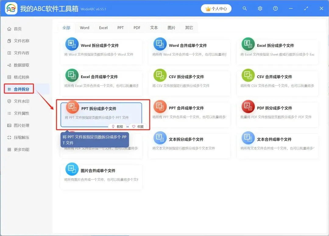 1.打开【我的ABC软件工具箱】,选择【合并拆分】-【PPT拆分成多个文件】。