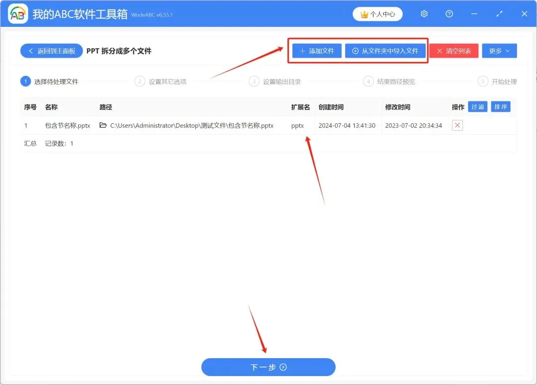 2.将需要拆分的PPT幻灯片导入工具箱,可以通过右上角添加文件、从文件夹中导入文件、直接将PPT幻灯片拖放到工具箱三种方式进行添加,添加完成后,点击下一步。