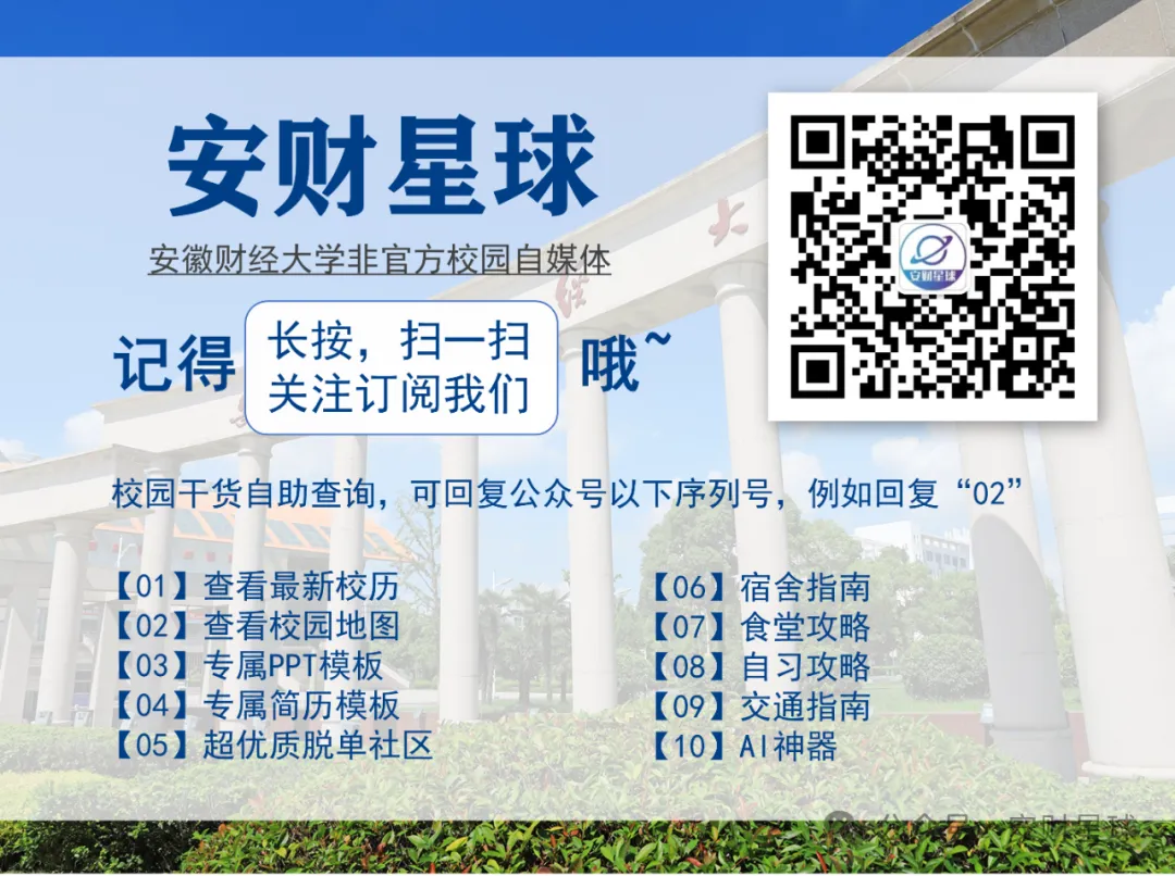 获取方式:扫码关注【安财星球】后台回复: 安徽财经大学