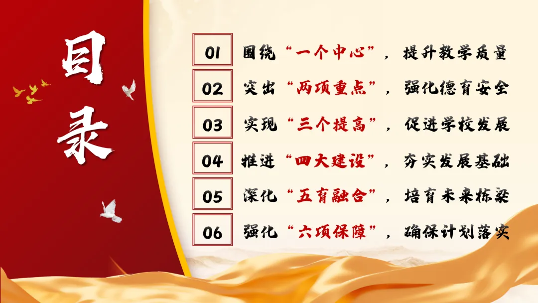 本学期,学校的工作将围绕“一个中心”“两项重点”“三个提高”“四大建设”“五育融合”“六项保障”展开。这些核心框架将为我们的工作提供明确的方向和指导,确保各项工作有序推进。