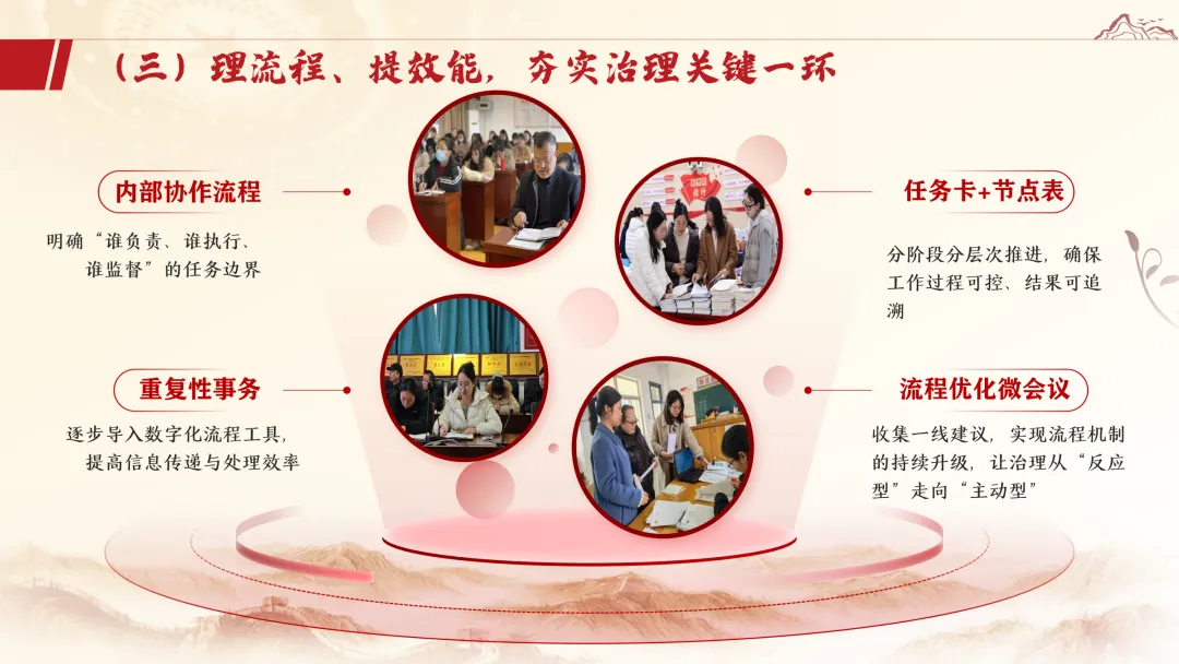 对于重复性事务,将采用任务卡+节点表的方式进行管理,分阶段分层次推进,确保工作过程可控、结果可追溯。定期召开流程优化微会议,收集一线建议,实现流程机制的持续升级,让治理从“反应型”走向“主动型”。