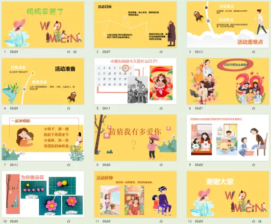 妇女节,又被称为"国际妇女节”、"三八节”和“三八妇女节”,这个节日起源归因于20世纪初期一系列的妇女运动大事。是在每年的3月8日为庆祝妇女在经济、政治和社会等领域作出的重要贡献和取得的巨大成就而设立的节日。纪念各国妇女百余年来争取和平、平等、发展的节日。为了让幼儿更深刻的了解这一节日,故本次活动以此为背景,围绕妇女节开展,让幼儿参与到节日中。引导幼儿“认识妇女节-了解妇女节-表达情感”,充分锻炼幼儿的社会能力。
