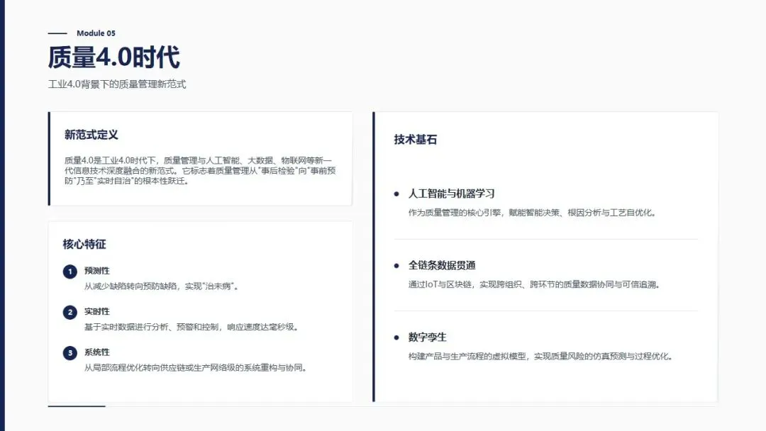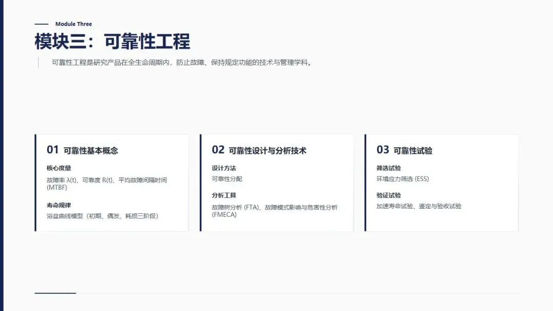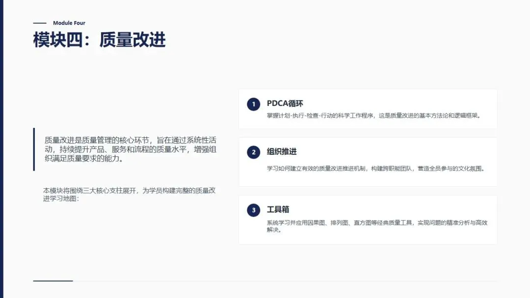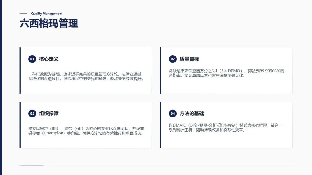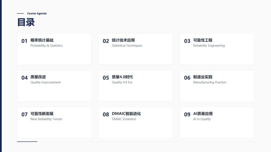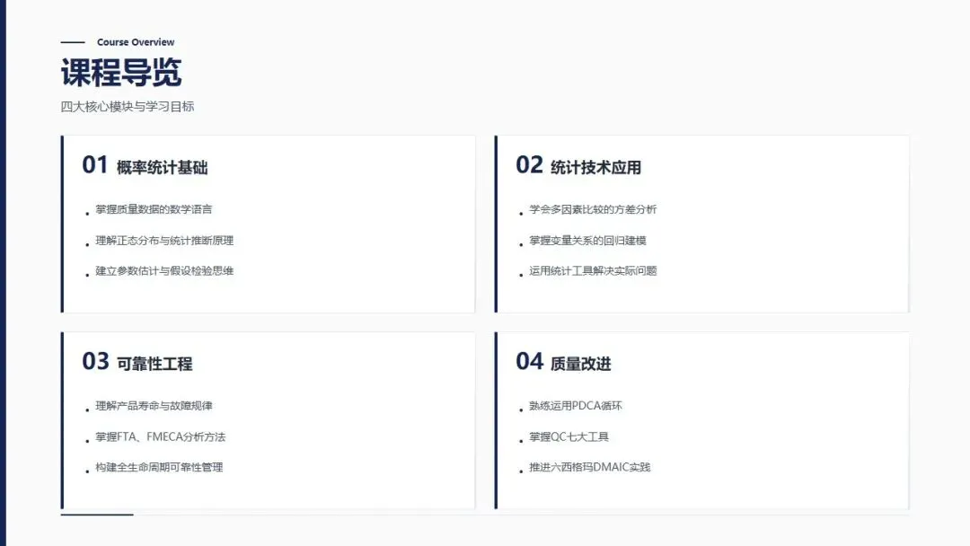 质量管理中级理论培训PPT,涵盖概率论基础、质量改进、可靠性、六西格玛四大模块