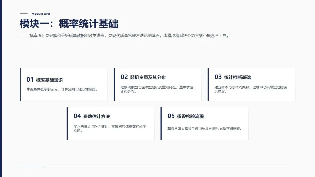 >质量管理中级理论培训PPT,涵盖概率论基础、质量改进、可靠性、六西格玛四大模块