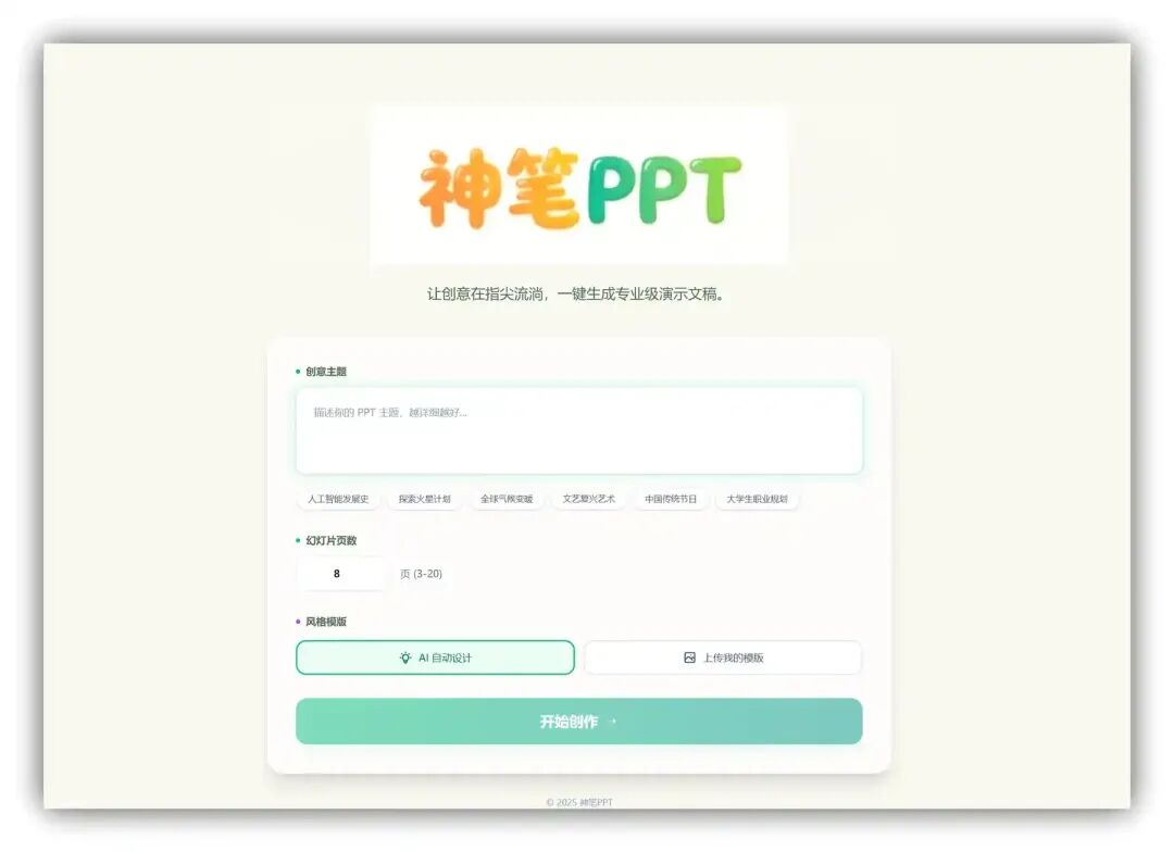 简介:神笔PPT 是一款基于人工智能技术的在线演示文稿(PPT)自动生成工具。用户只需输入主题或简要内容,系统即可快速生成结构清晰、设计美观的幻灯片,大幅降低制作门槛,提升办公与教学效率。
