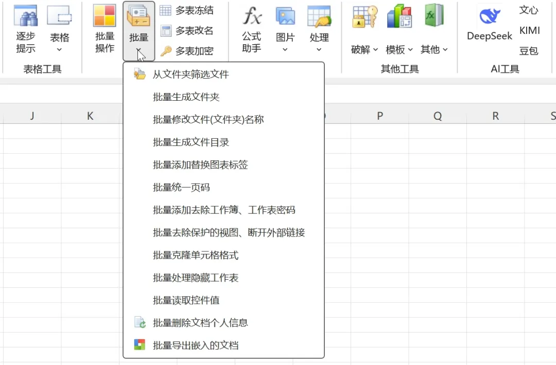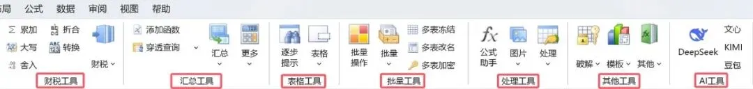在工具箱选项卡中可以看到,包含了很多实用的功能,如财税工具、汇总工具、表格工具、批量工具、处理工具等,而且还集成了AI功能。