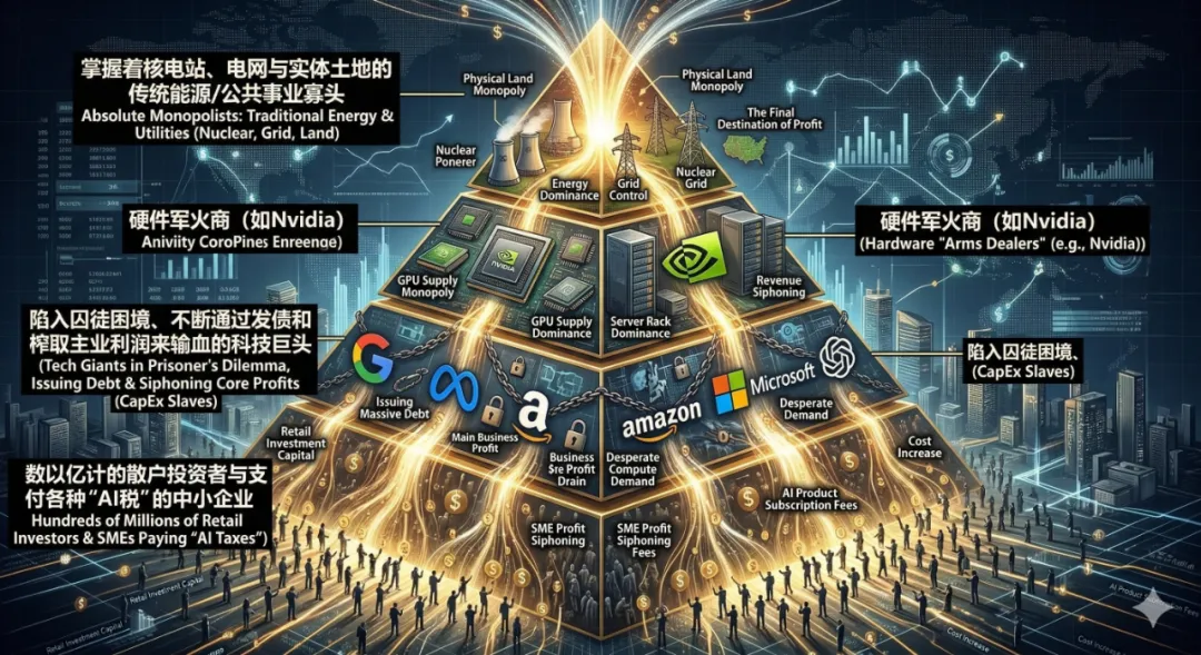在这场名为“人类迈向AGI”的宏大叙事中,无数散户、传统企业和中腰部创业者被当作了填补资本窟窿的耗材。利益的流向比任何复杂的Transformer架构都更清晰、更无情。让我们绘制一份2026年视角的利益相关者地图(Stakeholder Map),看透这桌价值万亿美金的德州扑克底牌。