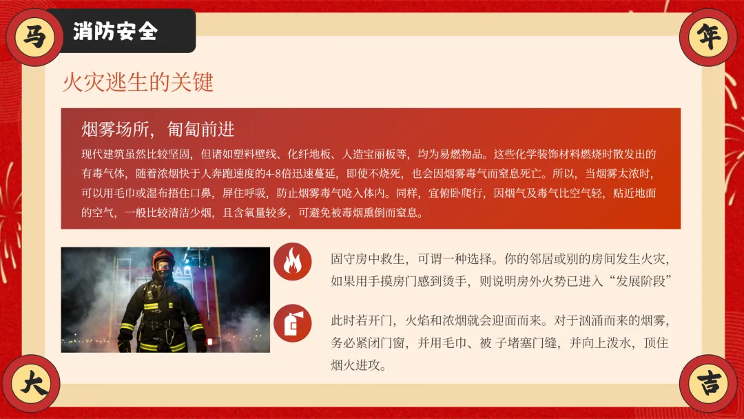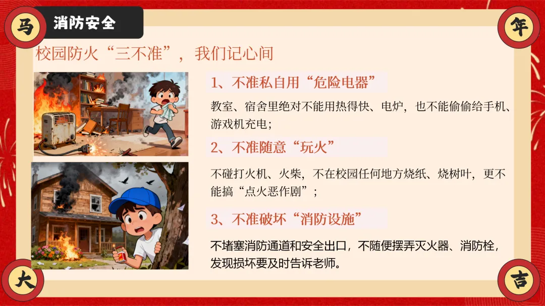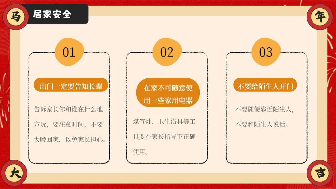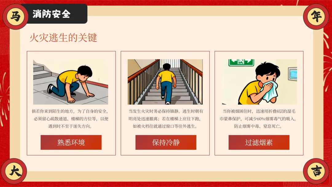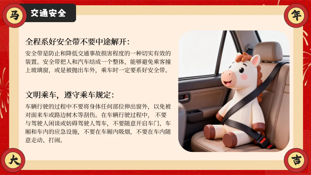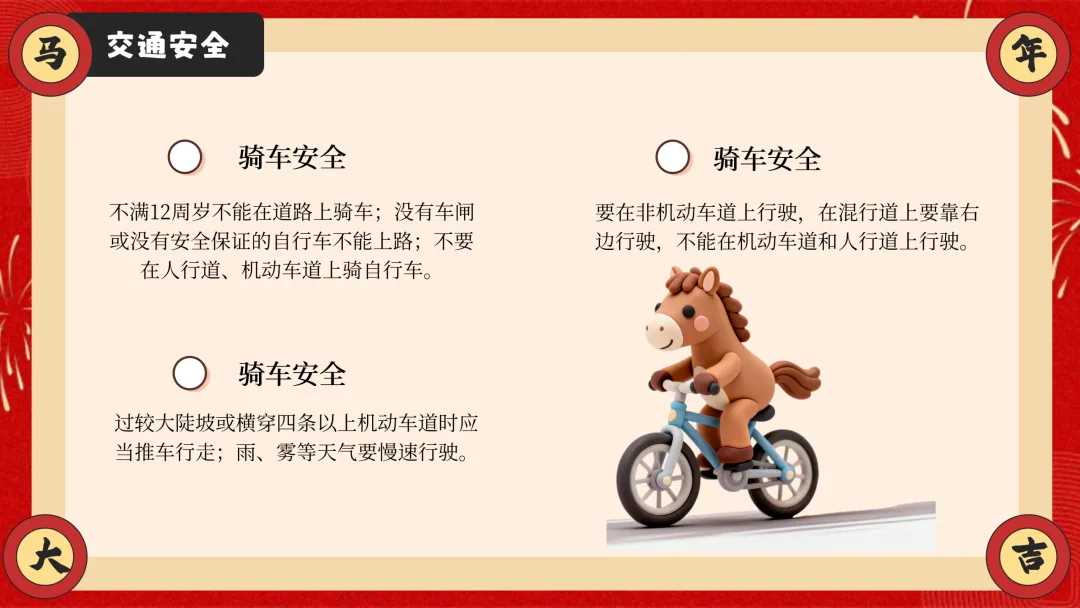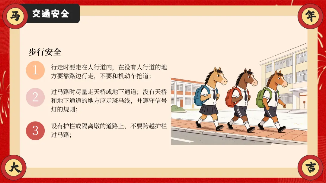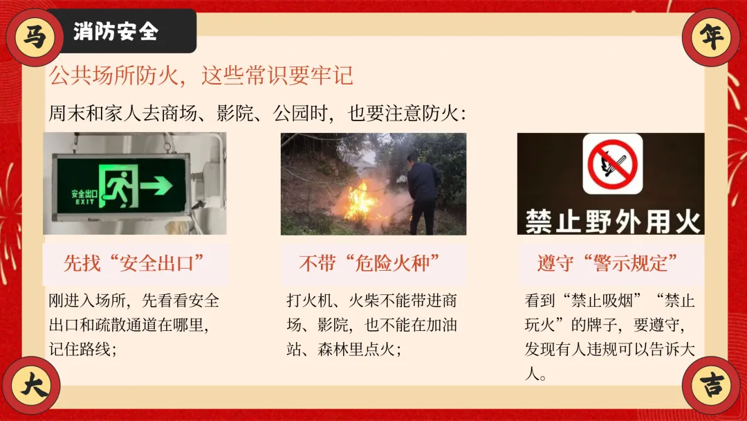 ppt以安全为核心,从交通安全、防溺水安全、消防安全三大户外与校园重点安全板块切入,详细讲解乘车、骑车、步行的安全准则,明确防溺水 “六不” 要求,结合真实火灾案例讲解防火要点与逃生技巧,干货满满且贴合学生生活实际。