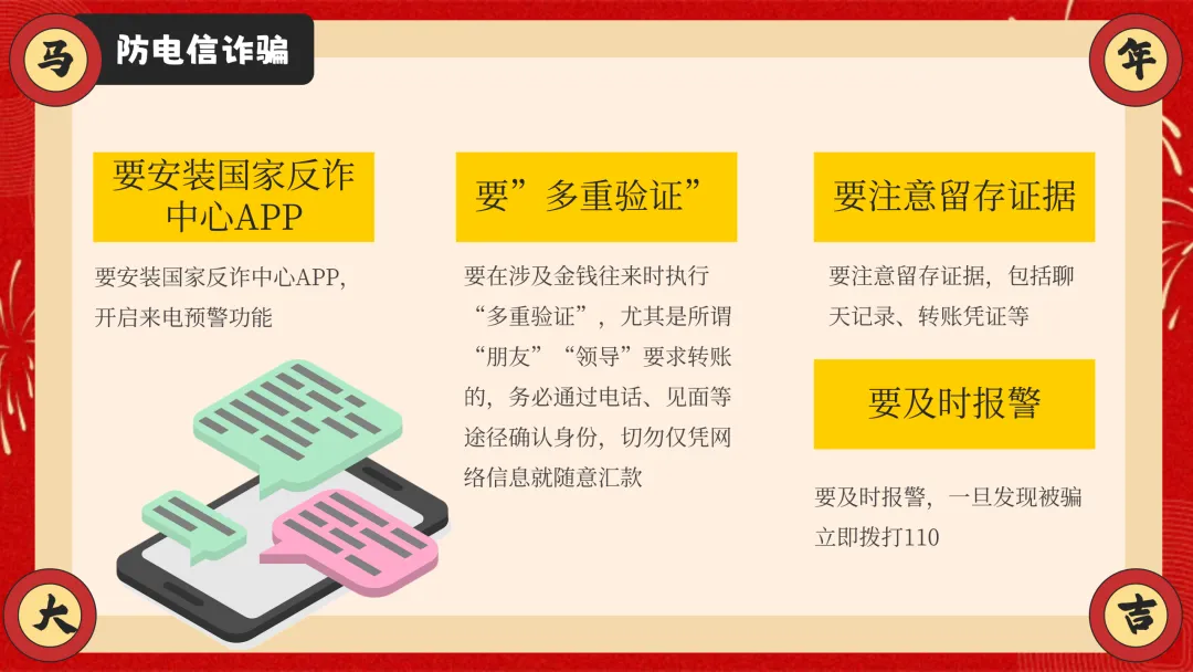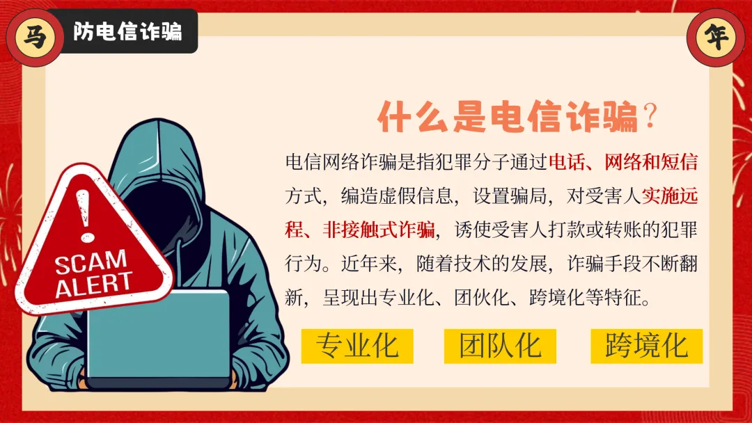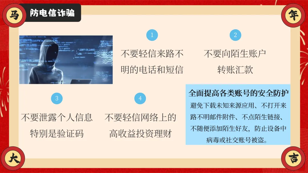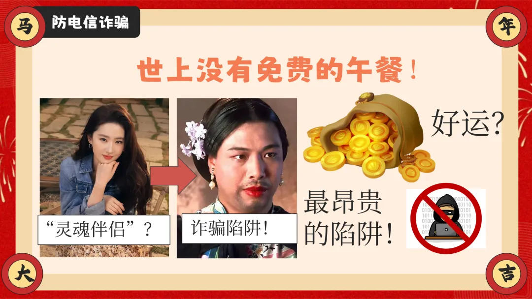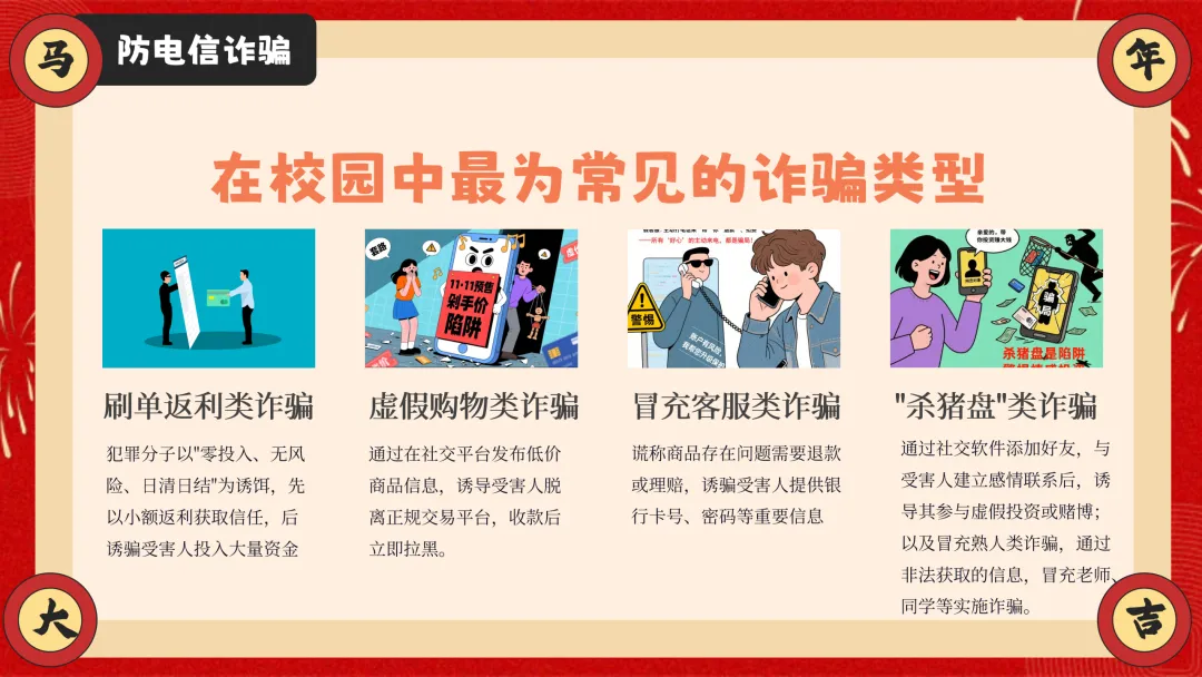 ppt还兼顾居家安全、食品安全两大生活安全内容,紧跟 AI 时代趋势加入防电信诈骗板块,拆解刷单返利、虚假购物等校园高频诈骗套路,教学生识别骗局、保护自身信息。