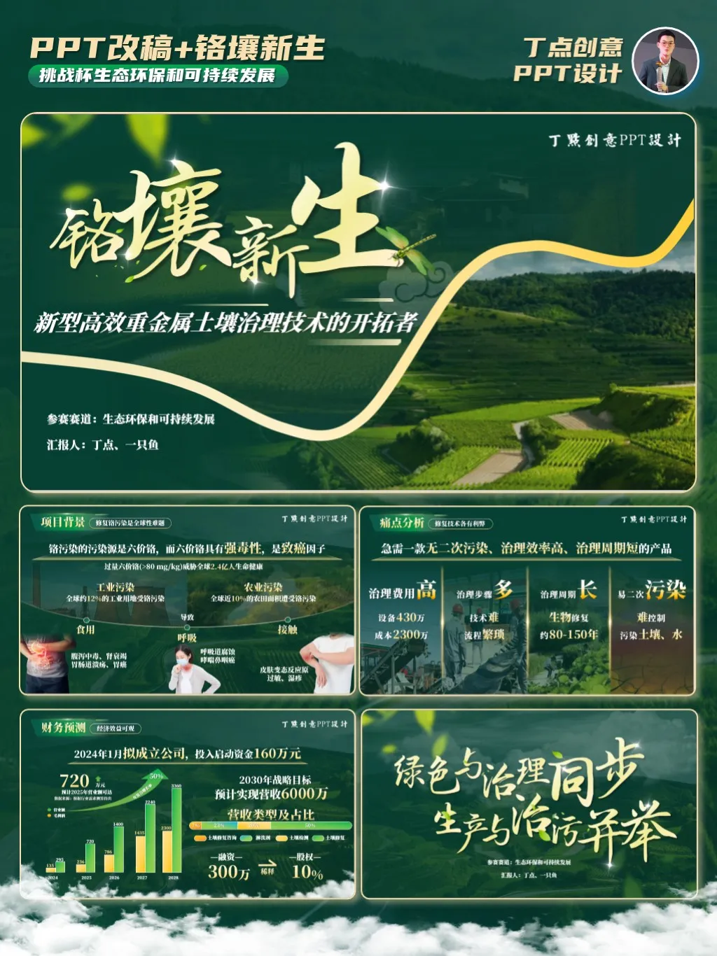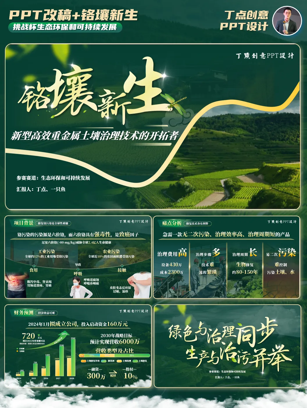 以下五页原稿,内容涵盖封面页、五段页、四段页、财务页及封底页的五种排版,属于双创大赛中的典型页面。