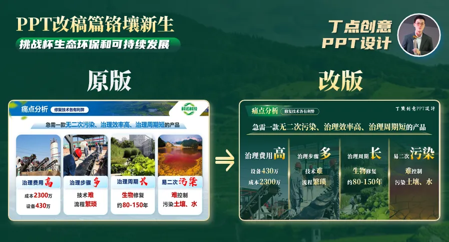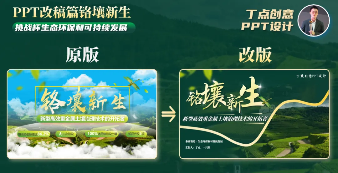 项目主要围绕土壤治理开展,据此可以联想到树叶、绿色土壤等元素。基本思路与原稿相近。但原稿的设计感与配色过于鲜艳,无法明显表达项目主题,也影响评委观感。所以我们通过暗黄色曲线分割的设计来增加美感,插入的绿地回应题目的同时弱化大面积暗绿色系带来的视觉疲劳。