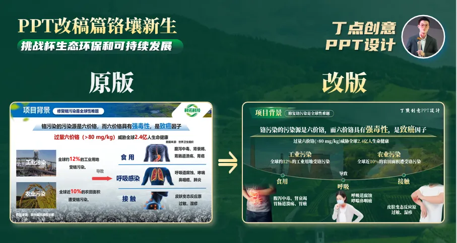 再来进行内容分析,原稿内容主要为两项污染的现状与会引起人体的病变。整体来看是五段式的因果逻辑。可以通过圆形的凸向与圆形标记来代替箭头。再加入与内容相关的图片帮助理解,最后排版文字就可以完成。