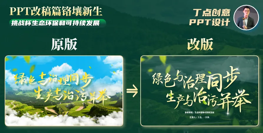 封底页与封面页类似,通过墨绿色背景与暗黄色的字体统一美化板式,减少云彩元素,重点表达项目生态环保的观点,用绿叶和白色光效来进行美化与点缀。最后加入竞赛信息与个人信息。